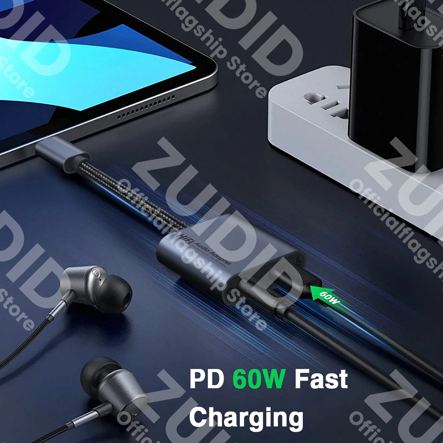 Adaptador de Audio auxiliar 2 en 1 USB C a 3,5mm/Tipo C PD60W carga rápida 32Bit/384KHz DAC Audio Aux auriculares Convertidor para iPad Samsung