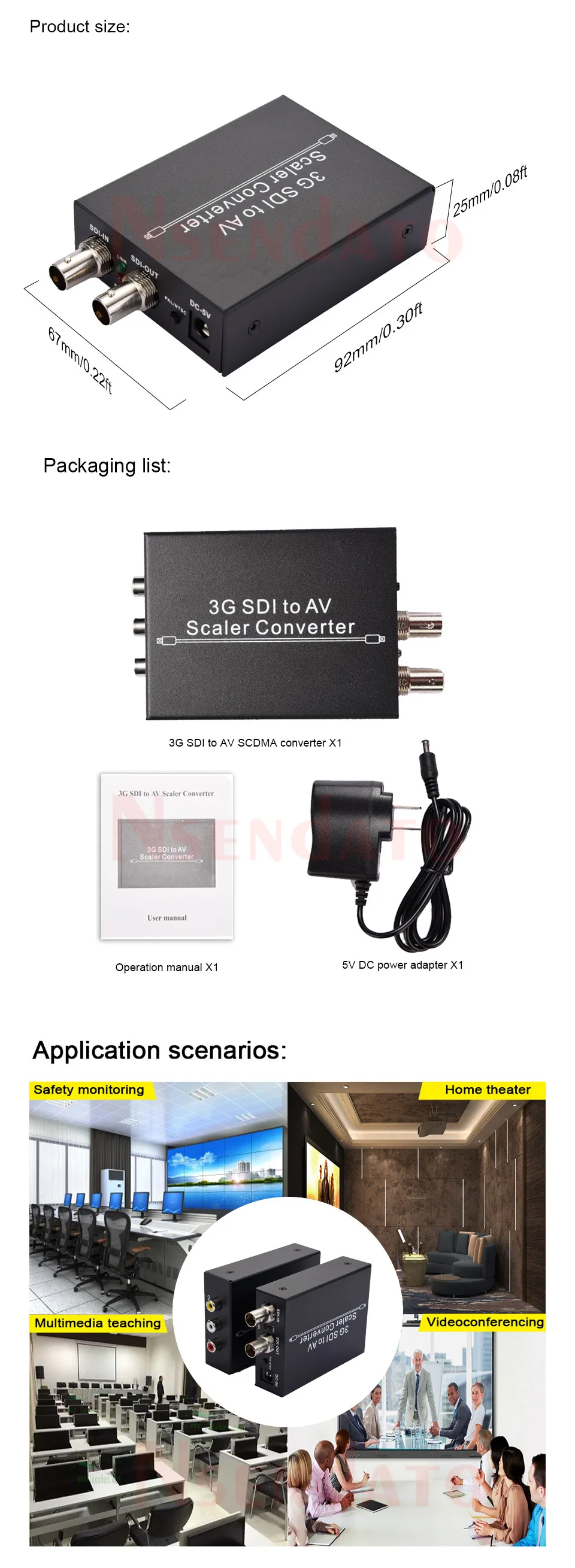 IntroducciónEl convertidor de escalador SDI a AV permite que las señales de SDI y 3G-SDI se muestren en CRT o HDTV al tiempo que garantiza altas velocidades de bits de 2.970 Gbit/s para brindarle una transmisión de señal rápida sin ninguna pérdida. Para los profesionales, esto significa que ahora es más fácil distribuir y ampliar su señal 3G SDI al tiempo que le da la capacidad de mostrar su trabajo en la televisión gracias al Convertidor incorporado. Además, gracias al diseño de bucle 3G-SDI, los usuarios pueden disfrutar de SDI y AV al mismo tiempo.CaracterísticasOperación a 2.970Gbit/s,2.970/1.001Gbit/s, Gbit 1.485/s,1.485/1.001Gbit/sSalida de bucle ecualizada y relocalizadaDetección automática del modo de vídeo (3G/HD/SD)Conversión de SMPTE 425M nivel B a nivel A 1080p 50/59.94/60 4:2:2 10 bitsConéctese con otras unidades para extender su señal a largas distanciasPantalla simultánea con señales SDI /AVSalida de audio alternativa a analógica 2CHAdmite distancias de transmisión de señal de hasta 300M para señales SD, 200M para señales HD y 100M para señales 3G.Nota: Cable probado con Belden 1694A. Las distancias de funcionamiento pueden variar si se utiliza con otro tipo de cable.EspecificacionesEstándar SMPTE: 425M Nivel A y B, 424M, 292M, 259M-CTasas de transmisión SDI: 2.970 Gbit/sResolución de entrada/salida SDI: HD:720P @ 50/60,1080i @ 50/60 3G:1080P @ 24/25/29.97/30/50/59.94/60Resolución de salida CVBS: PAL/NTSCPuerto de entrada: 1xBNC (HD/3G-SDI)Puerto de salida: 1xBNC (HD/3G-SDI),3xRCA(CVBS,L/R)Fuente de alimentación: DC 5VProtección ESD modelo de cuerpo humano: ± 8kV (descarga de espacio de aire)Paquete:Convertidor 3G SDI a AV Sclaer5V DC adaptador1 * Manual