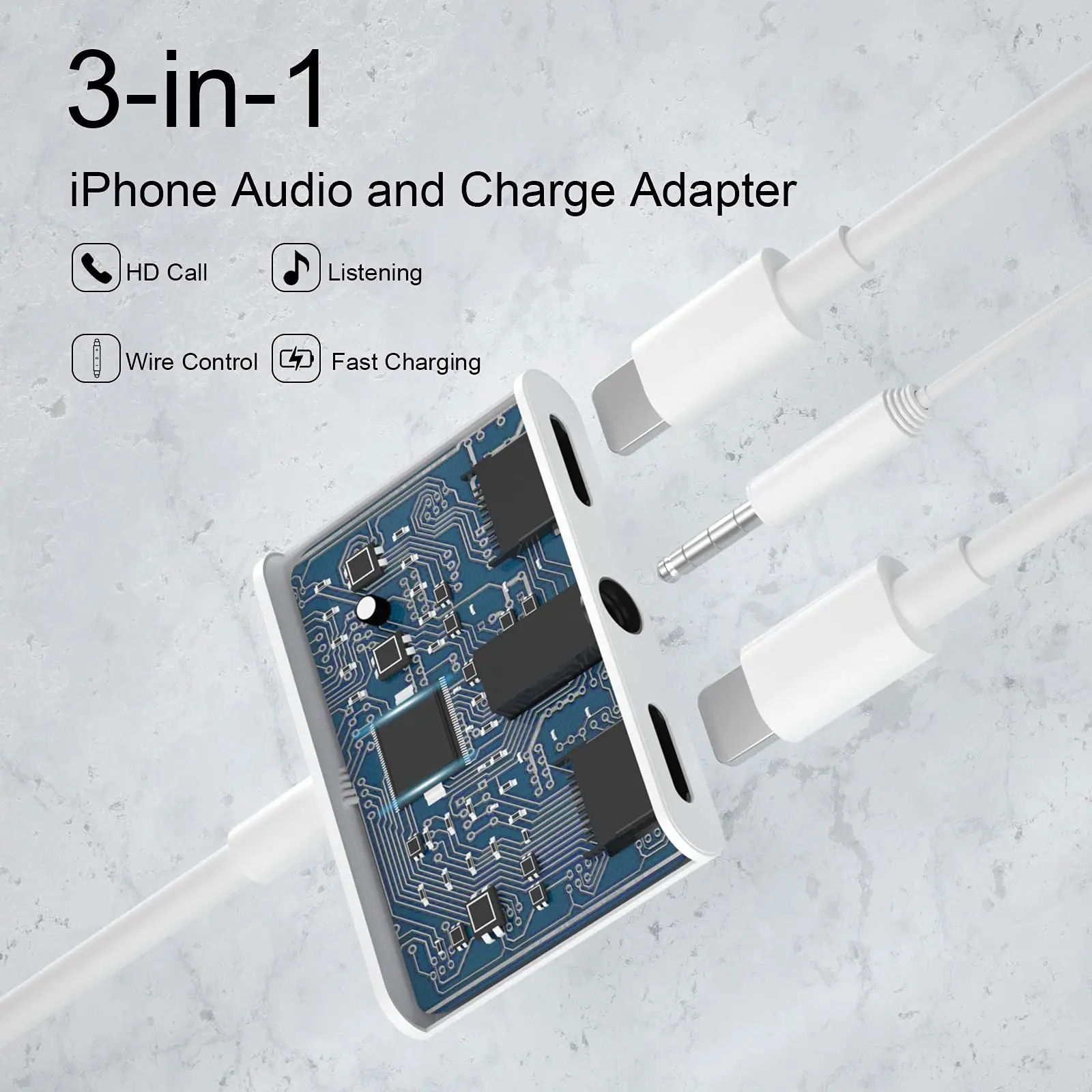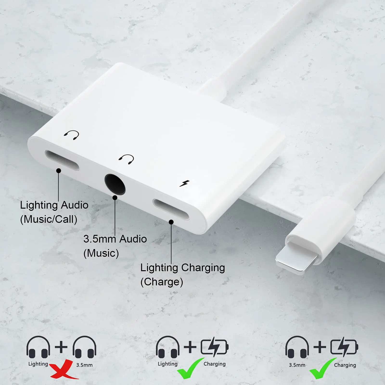 El adaptador de auriculares para iPhone está diseñado con una función de carga rápida de 2,4 A, la velocidad de carga aumenta 1,5 veces. No se preocupe por que su teléfono o almohadilla se quede sin energía mientras Disfruta de música o películas.