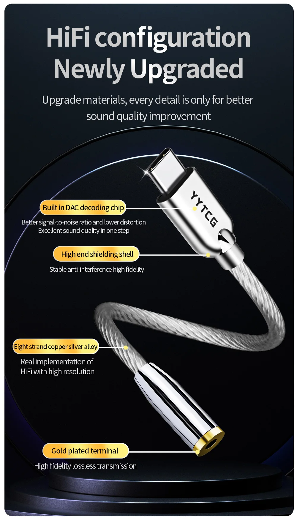 Chip decodificador DAC integrado relación señal-ruido entrefer y menor distorsión Excelente calidad de sonido en un solo paso Carcasa de blindaje de alta gama Antiinterferencias estable de alta fidelidad Aleación de plata y cobre de ocho hilos Implementación real de Hifi con alta resolución Terminal chapado en oro Alta fidelidad transmisión sin pérdidas