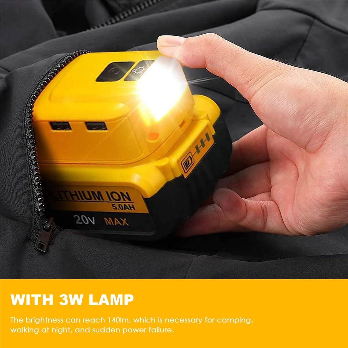 1. Reemplace el convertidor de potencia Dewei DCB090, compatible con baterías de litio Dewalt 12-18V. 2. Dos puertos USB pueden cargar simultáneamente dispositivos electrónicos de 5V/2,1 A. 3. Es compatible con el convertidor de batería, y tres luces LED muestran el estado de carga de la batería. 4. Los materiales ABS son más respetuosos con el medio ambiente y reducen los riesgos para las personas. 5. Con W lámpara de 3, el brillo puede alcanzar 140lm, que es necesario para acampar, caminar por la noche y un corte de energía repentino. Nombre del producto: 14,4 V-20V con luz de 3W. Parámetros de entrada: V-20V. Parámetros de salida: 5V 2.1A/12V 2A. Color: amarillo. Material: plástico ABS. Contenido del paquete: 1 x adaptador de batería DCB090 1 2,1mm x 5,5x30cm 12V DC cable (cable de CC color y estilo aleatorio, no acepta lo especificado) solo el contenido del paquete anterior, Otros productos no están incluidos. Nota: La luz y las diferentes pantallas pueden hacer que el color del artículo en la imagen sea un poco diferente del real. El error de medición permitido es +/- 1-3cm.