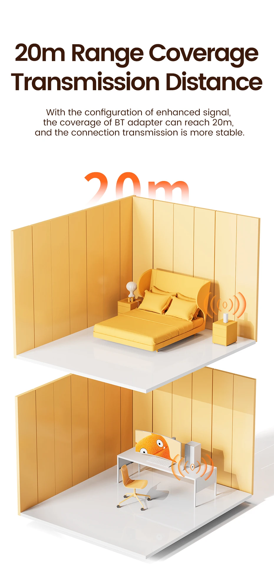 La configuración de señal mejorada garantiza un rango de cobertura de hasta 20 metros para una conexión y transmisión estables.