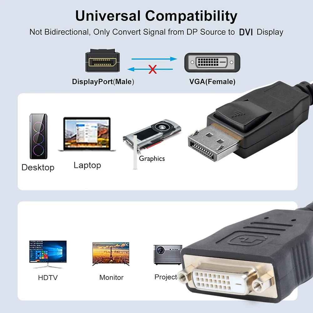 1) El cable DP a DVI solo admite resoluciones de enlace único DVI-D, es decir, 1080P@60Hz como máximo.