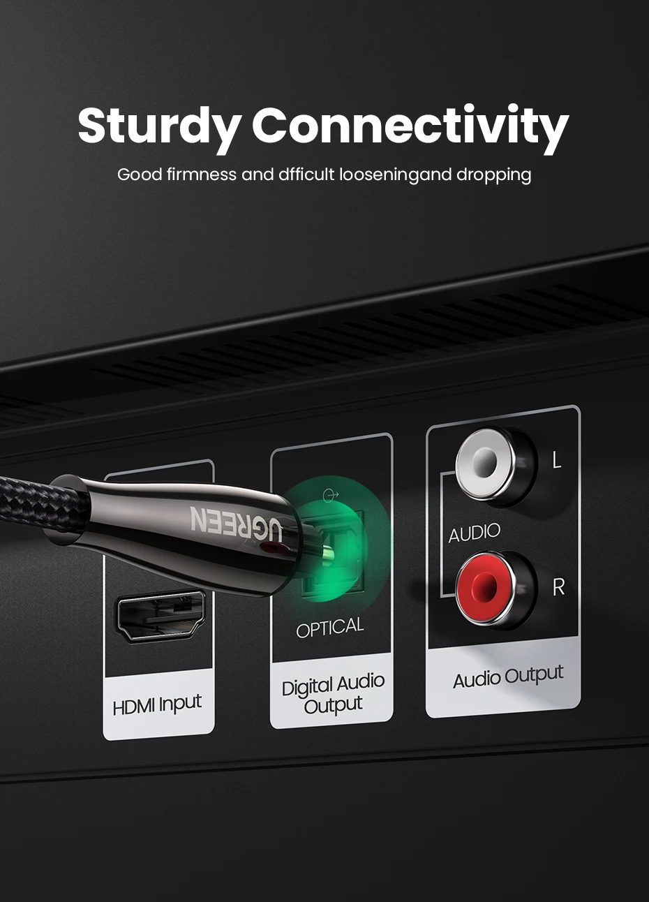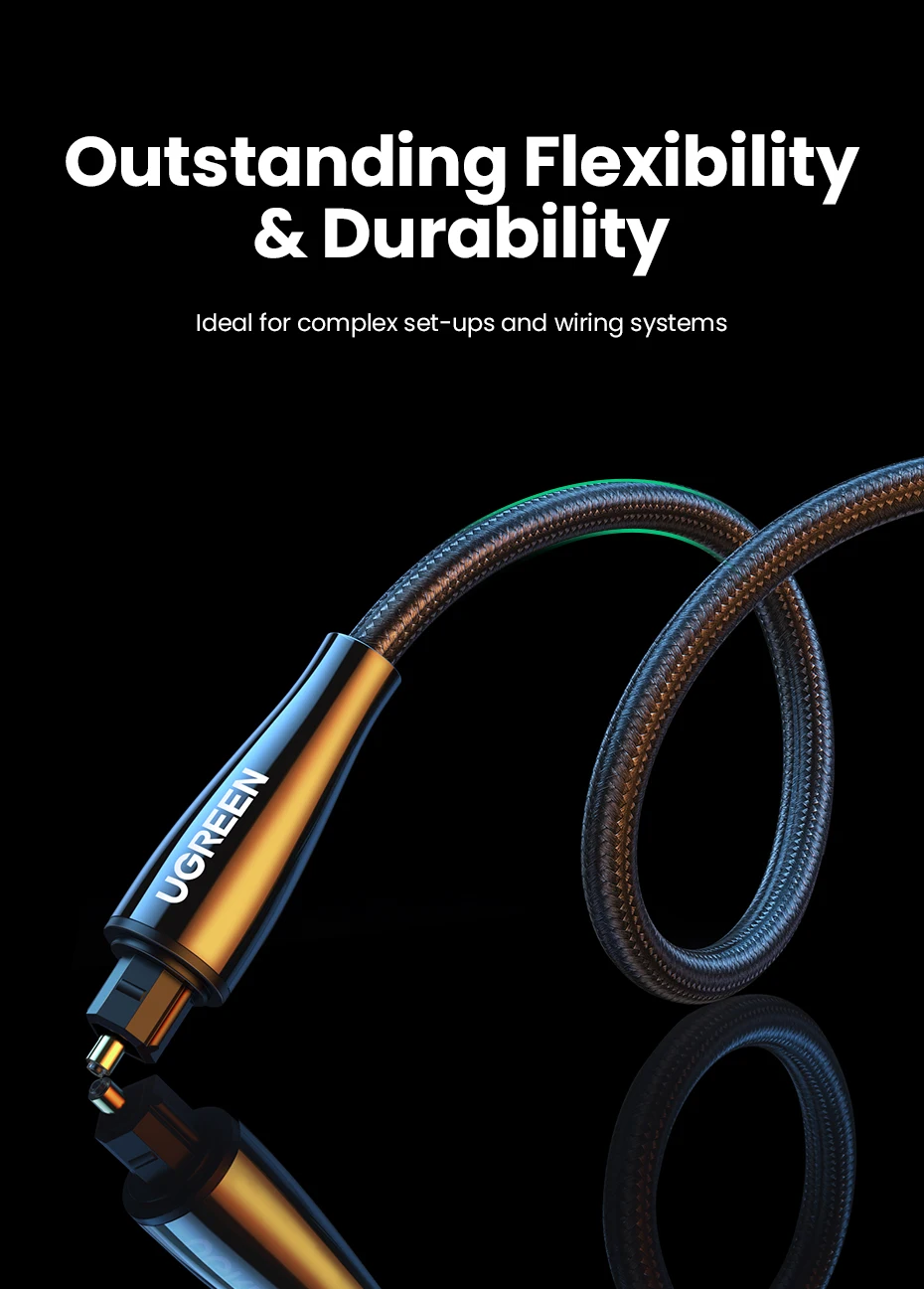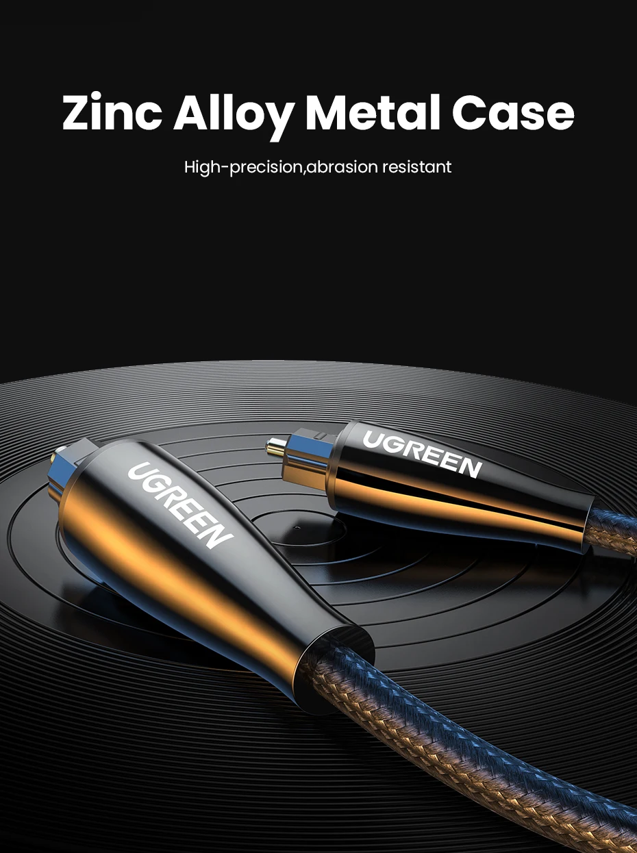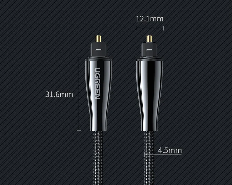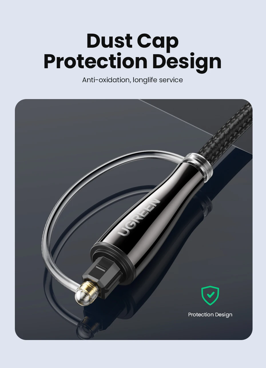 El cable de audio digital óptico Ugreen Toslink lleva un flujo de audio digital usando un cable de fibra óptica. Es perfecto para conectar dispositivos de audio, como reproductores de CD o DVD a un receptor o preamplificador. Proporciona un sonido limpio y preciso, sin distorsión ni interferencias de señal.