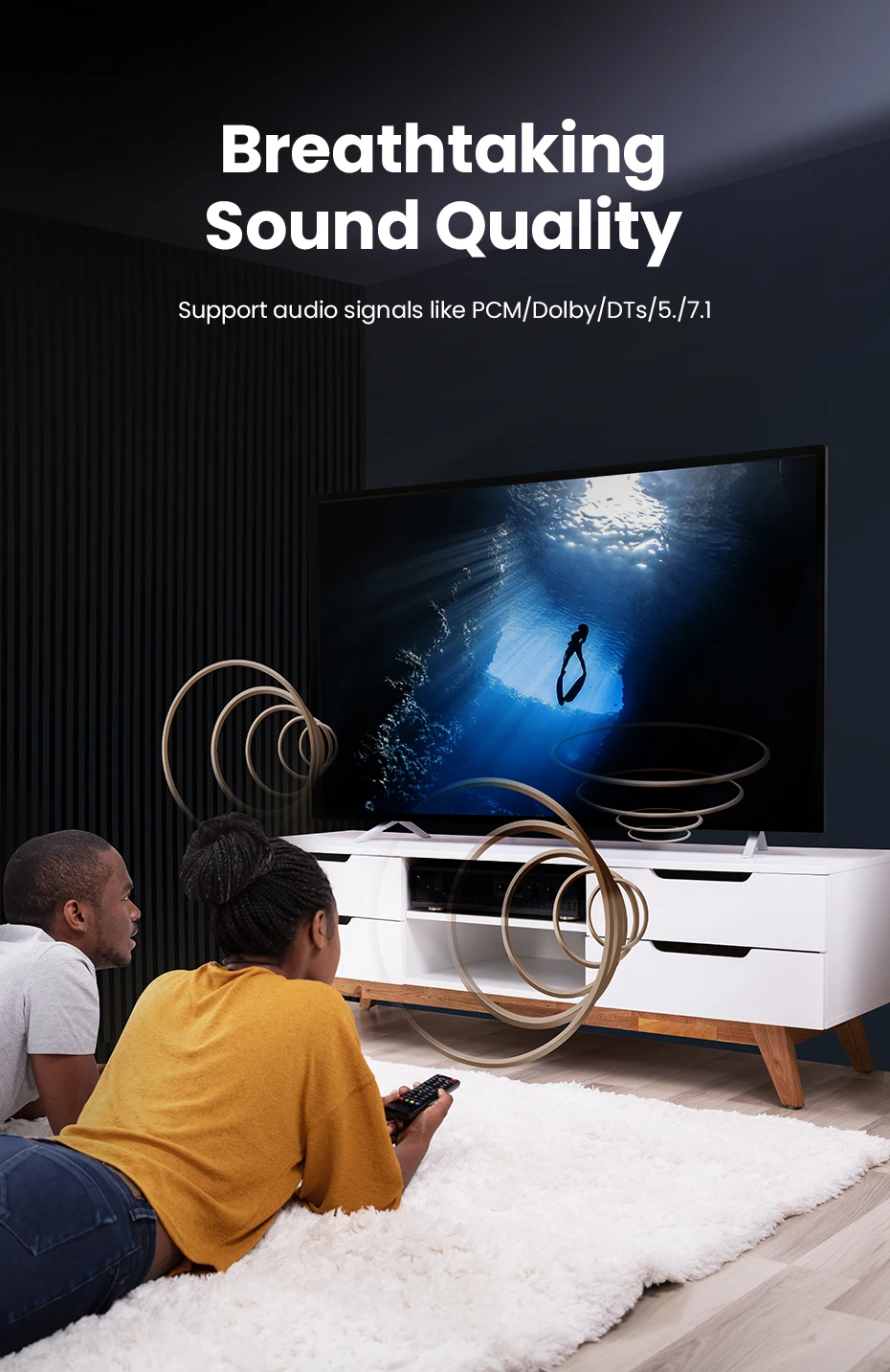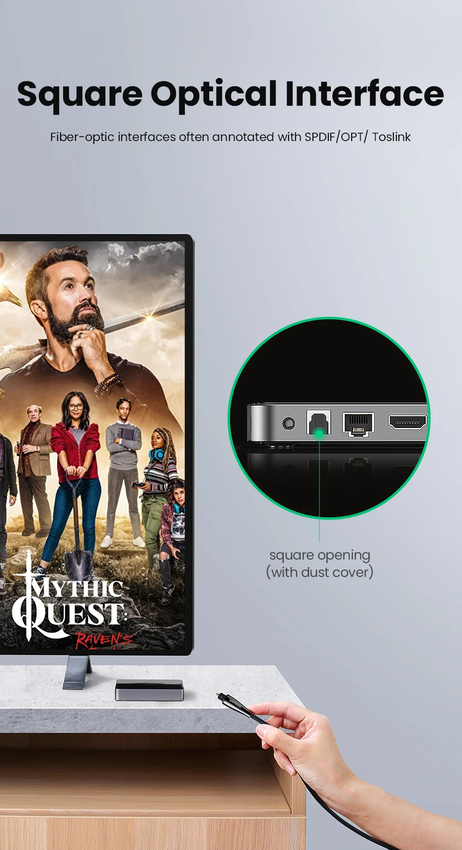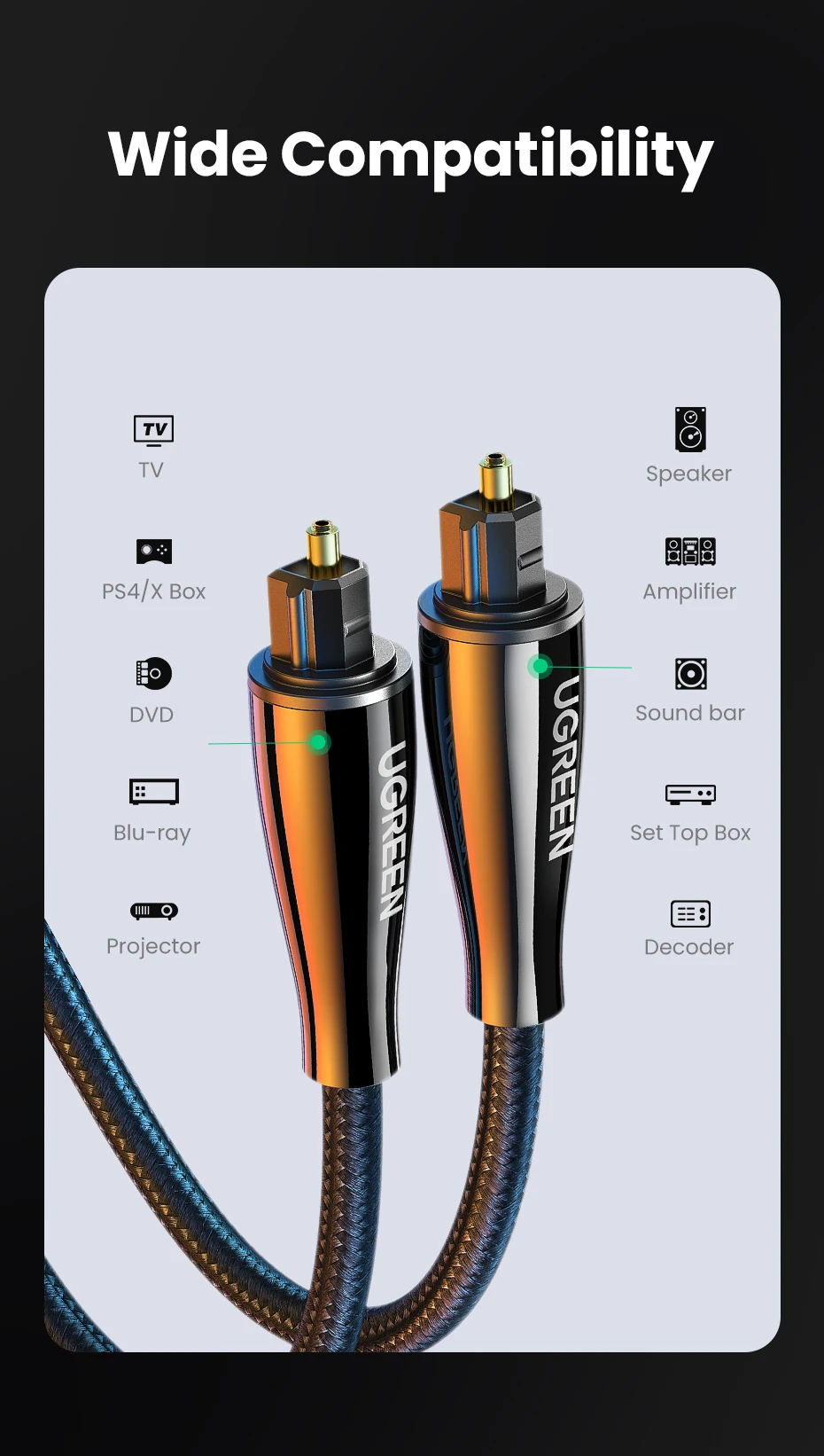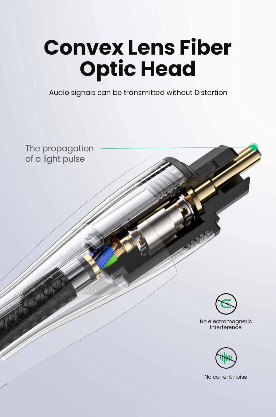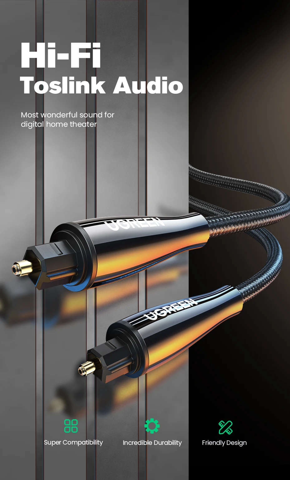 El cable de audio digital óptico Ugreen Toslink lleva un flujo de audio digital usando un cable de fibra óptica. Es perfecto para conectar dispositivos de audio, como reproductores de CD o DVD a un receptor o preamplificador. Proporciona un sonido limpio y preciso, sin distorsión ni interferencias de señal.