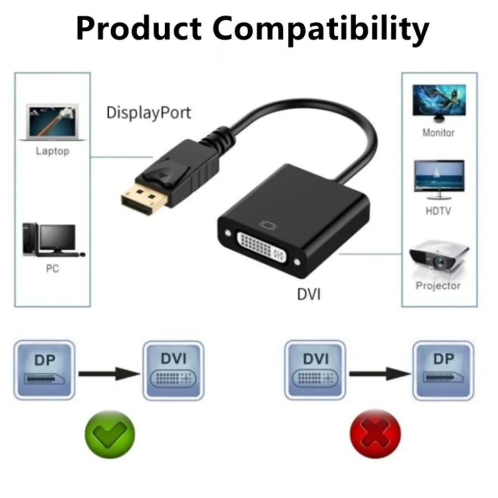 (2) ¡El nuevo convertidor Displayport (DP) macho a DVI hembra es adecuado para la transmisión de señales de audio y video entre computadoras con interfaces Displayport y dispositivos de visualización como televisores o proyectores con interfaces DVI!