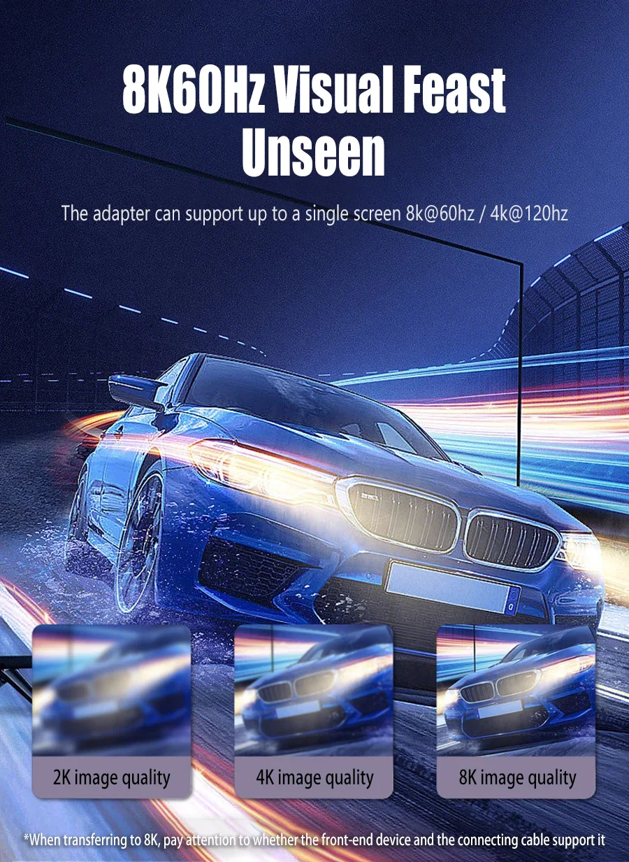 Función 2:Admite Salida de sincronización de audio y vídeo, hasta una sola pantalla compatible con 60Hz @ 8K/4k @ 120Hz.