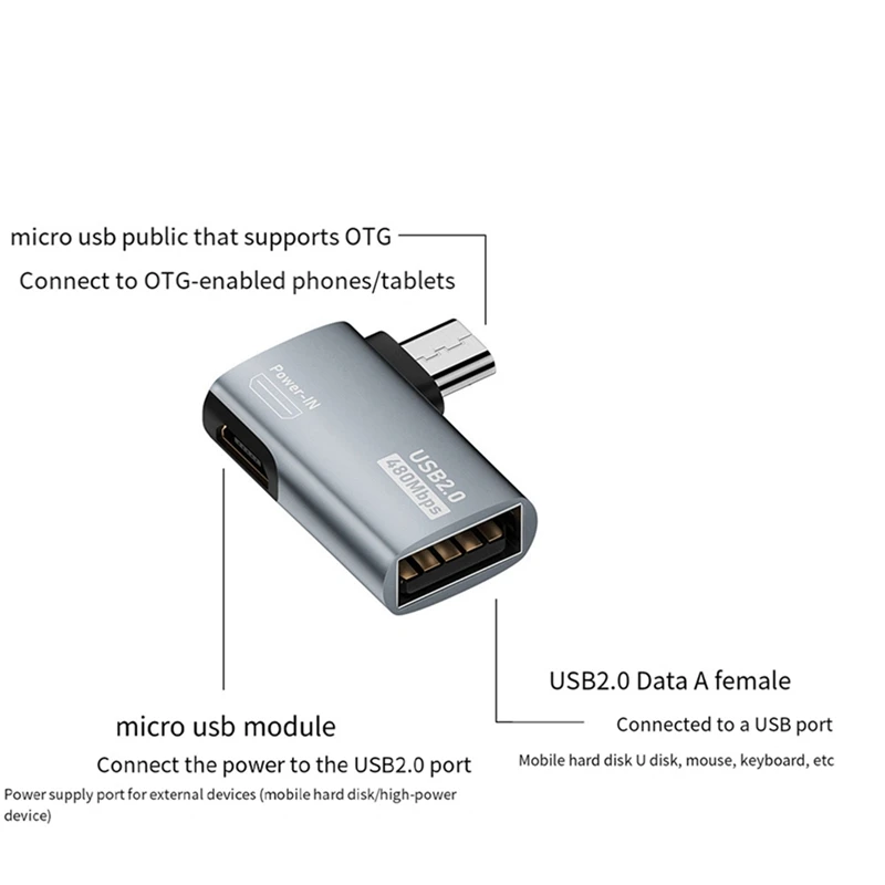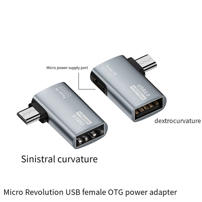 Función: Transferencia de datos 2.0 Interfaz: entrada tipo micro/salida USB-A Velocidad de transmisión: 480Mbps Teléfonos móviles/tabletas compatibles con OTG Nombre del producto: Adaptador de fuente de alimentación OTG hembra USB Revolution tipo Micro Voltaje: 5V/2A Color: plata Material: aleación de aluminio Especificaciones: izquierda/derecha