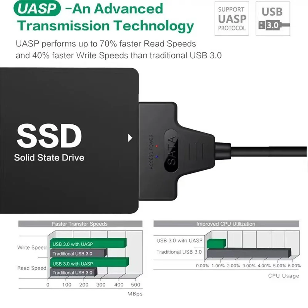 Especificaciones:1. Adpter SATA III Cable USB 3.0 Disco duro externo USB a Serial ATA Convertidor de 22 pines Disco duro 6 Gbps para HDD/SSD de 2,5".2.Este cable convertidor USB 3.0 a SATA conecta cualquier disco duro SATA estándar de 2,5 pulgadas o unidad de estado sólido (SSD) a una computadora a través de puertos USB 3.0.Es ideal para realizar copias de seguridad de archivos o actualizar el controlador duro de su computadora portátil.3.Especificación SATA 3 Admite velocidad de hasta 6 Gbps;4.Acceso fácil y rápido al almacenamiento externo;5.Indicador LED de actividad;6.Totalmente compatible con USB 3.0 y compatible con versiones anteriores de USB 2.0/1.1;7.Plug and play, intercambio en caliente;8.Compatible con Windows 98/2000/XP/Vista/7/8, Mac OS X.9.Nota: Solo disponible para discos duros de portátiles y SSD, no disponible para discos duros de escritorio de 3,5 pulgadasCumple con los estándares serial ATA2.0.Compatible con puerto USB (1,0,1,1 y 2.0) y disco duro SATA (1,5 GB/S y 3 GB/s).Se agregó una interfaz de fuente de alimentación independiente USB2.0, admite un controlador de memoria de alta capacidad de 2,5".Compatible con Windows 7 (32 bits/64 bits)/Vista (32 bits/64 bits)/XP (32 bits/64 bits)/servidor 2003 y 2008 (32 bits/64 bits) Sistema AEl paquete incluye:1 cable SATA USB 3.0 de 22 pines para SSD de 2,5".