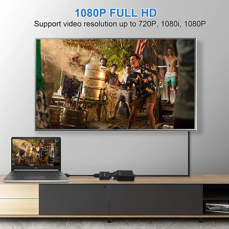 4. Convierte video VGA y audio USB 2CH en Compatible con HDMI y se muestra en HDTV / Monitor.
