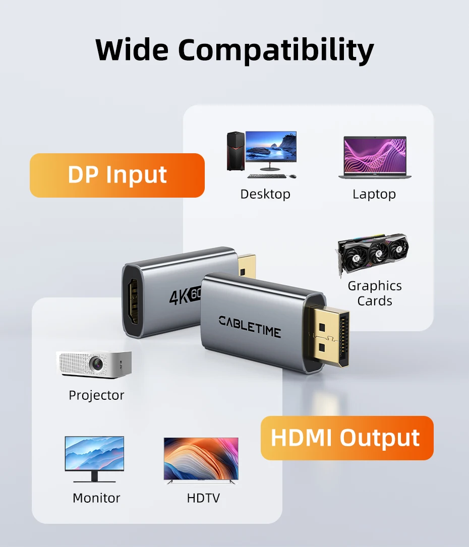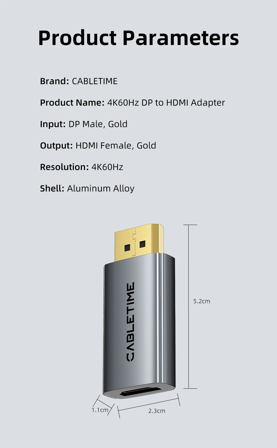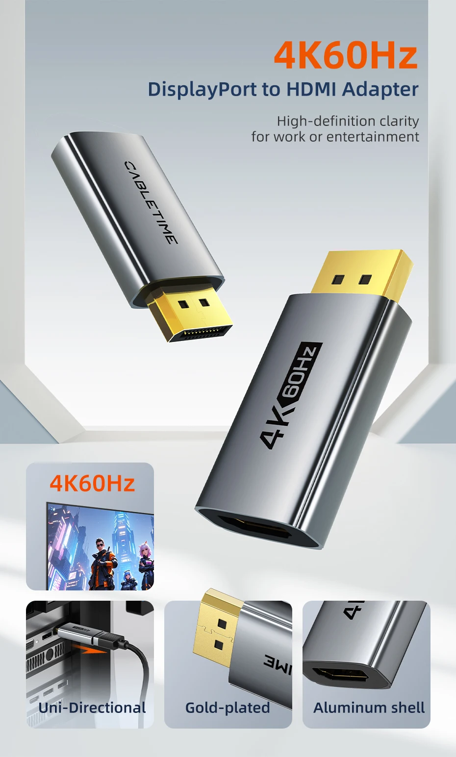 Comprar Adaptador CABLETIME DP a HDMI 4K30Hz/60HZ convertidor DisplayPort a HDMI convertidor DP macho a HDMI hembra para ordenador portátil PC TV
