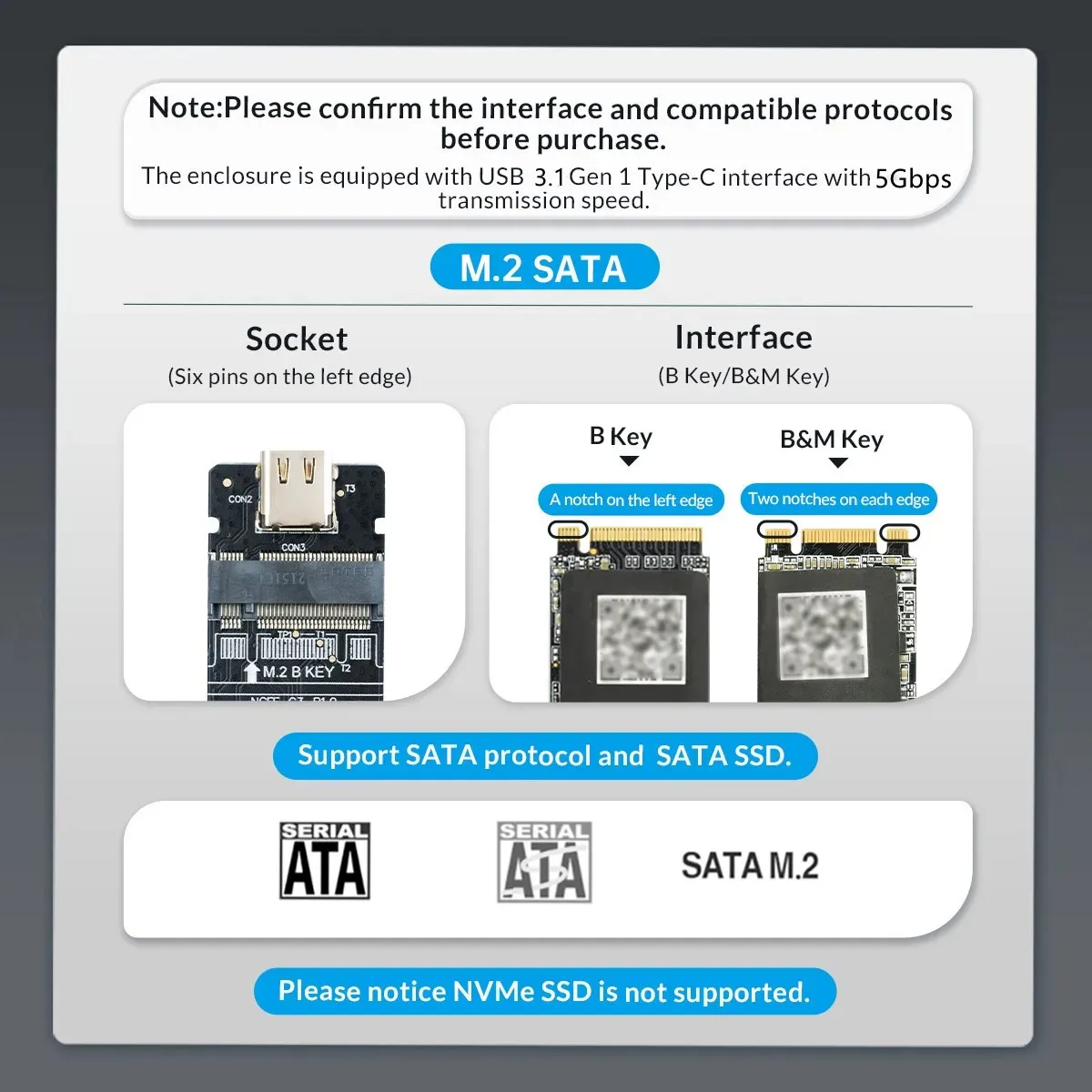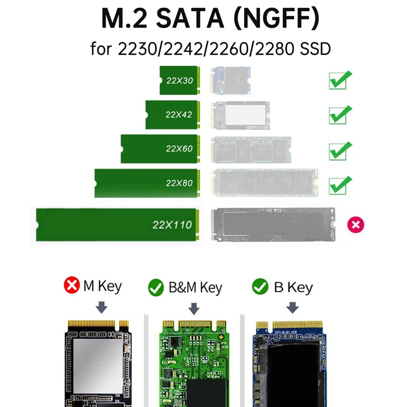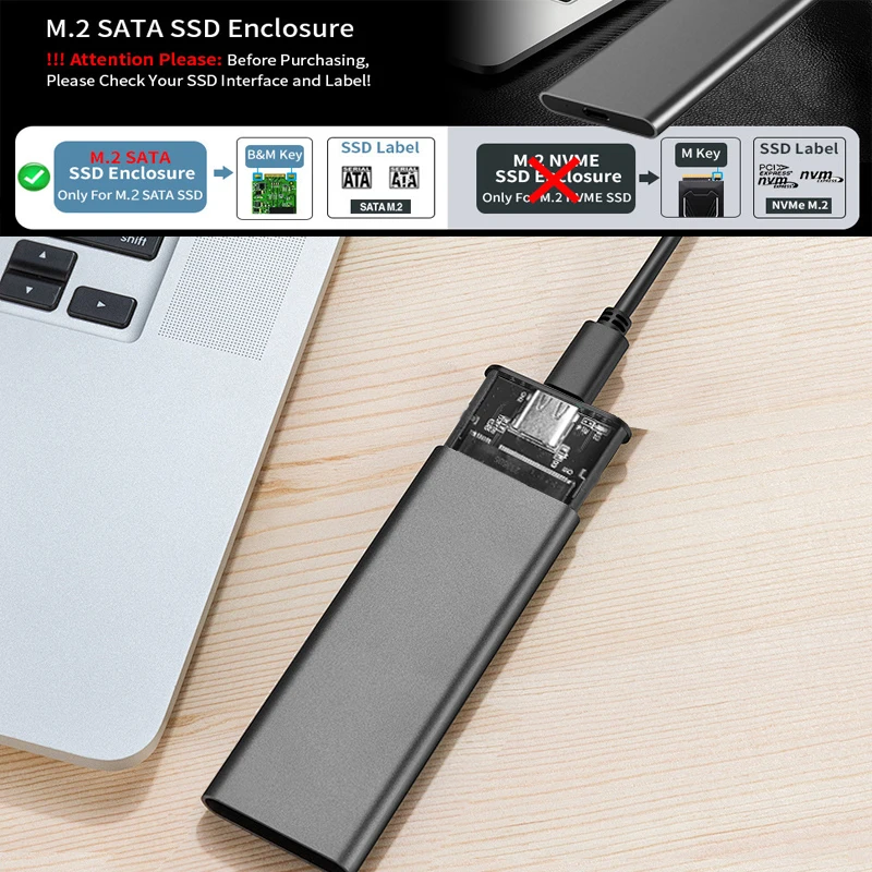 【SSD aplicable】 – Este M.2 La carcasa SSD admite M. basada en SATA.2 NGFF (tecla B/tecla B+M) SSD 2230 2242 2260 2280 mm controladores de estado sólido, no es compatible con NVMe/PCIe M.SSD con clave de 2 M;Antes de comprar, verifique la etiqueta de su SSD; si imprime PCIE, NVME, este gabinete no será compatible