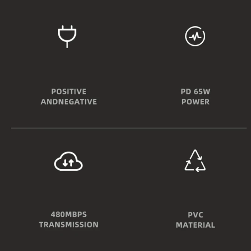 Tipo-C macho a macho, adaptador de cargador en forma de U, carga PD 65W, transmisión de datos de 480Mbps.