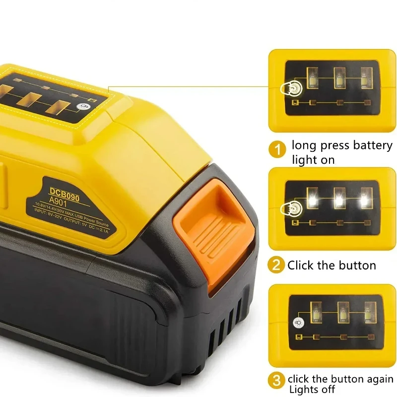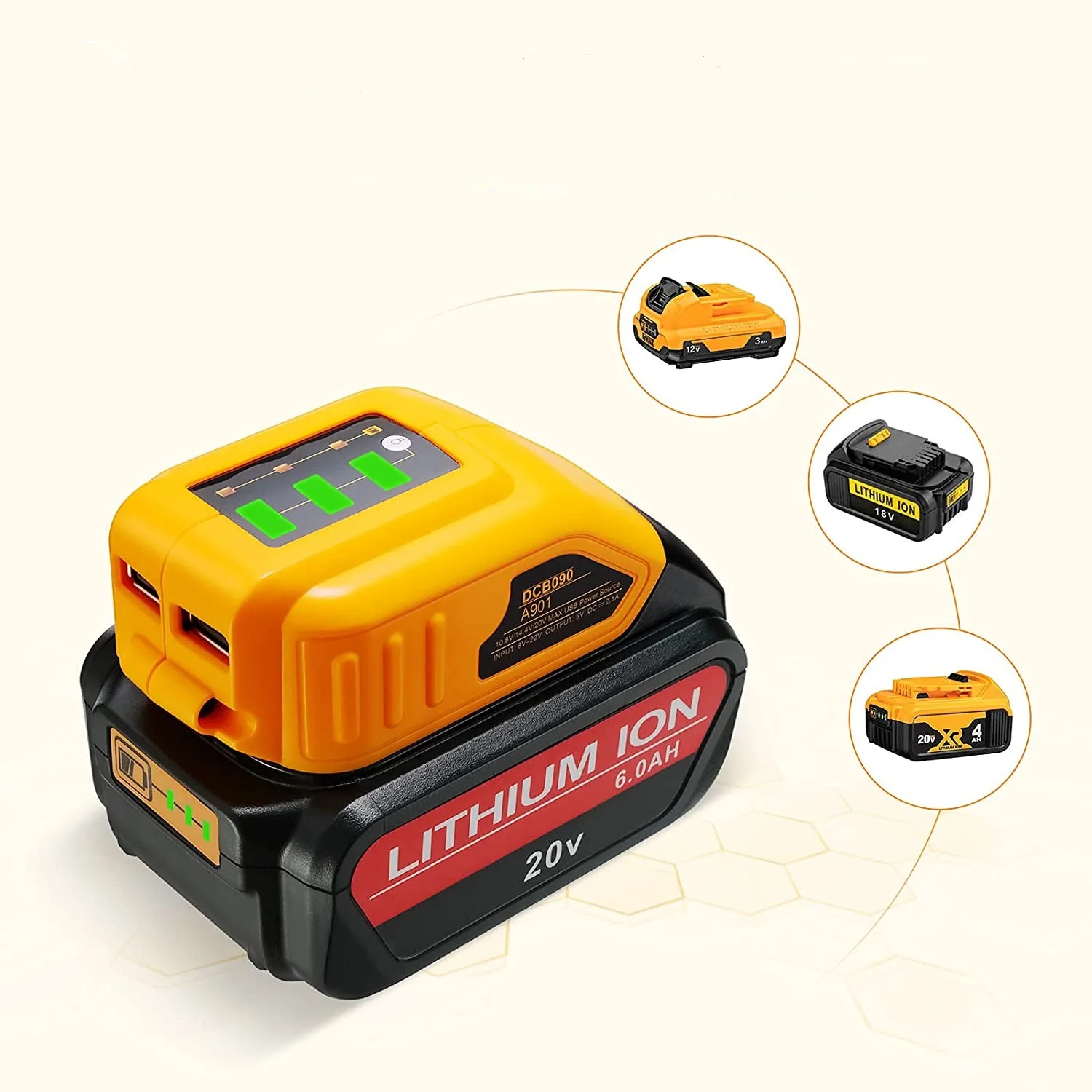 Comprar Adaptador de cargador de batería DCB090, Compatible con baterías de iones de litio Dewalt 12/14,4/18/20V, fuente de alimentación USB Dual, cargador portátil