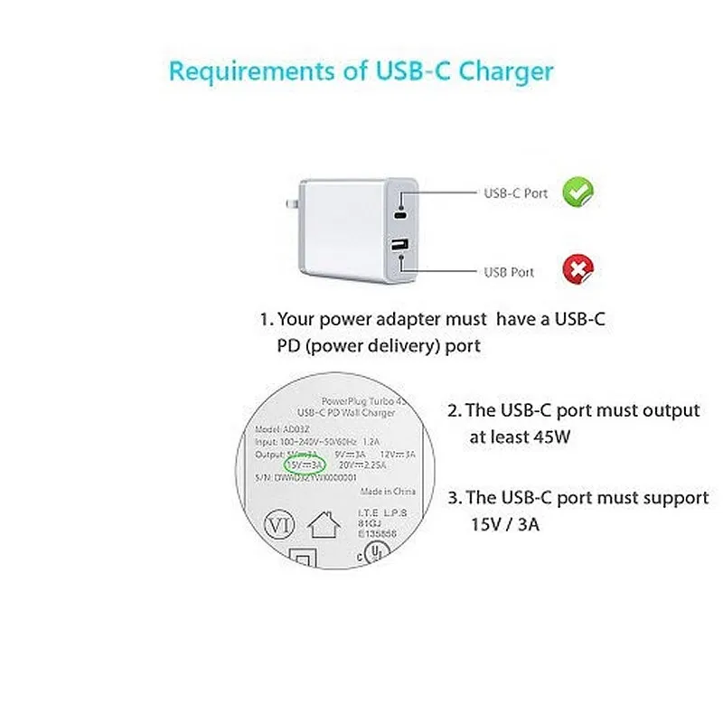 Asegúrese de que su cargador PD tipo C sea compatible con salida de 15V