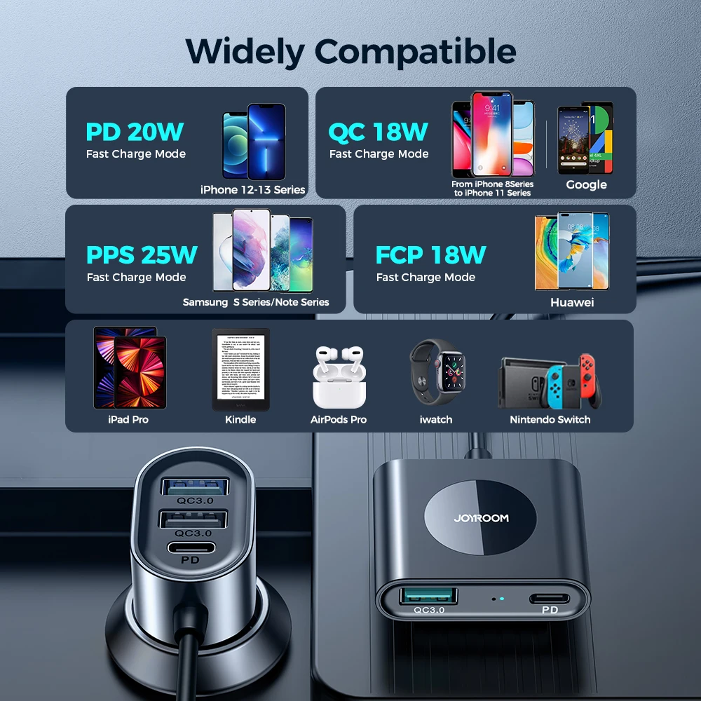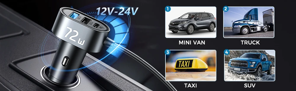 【Compatibilidad universal】 Compatible con toda su tecnología favorita, como teléfonos inteligentes, Galaxy, Pad, tabletas Android, Banco de energía, controladores de videojuegos, reloj deportivo, cámara y otros dispositivos alimentados por USB. Universal para vehículos de 12-24V, se adapta a los tipos de vehículos convencionales como automóviles, SUV, camiones, todoterreno.