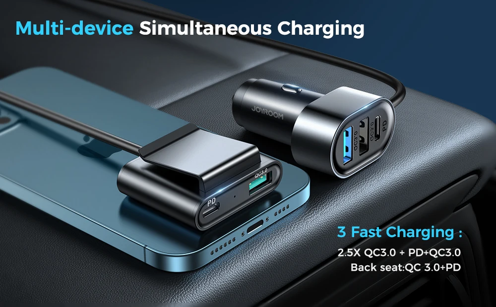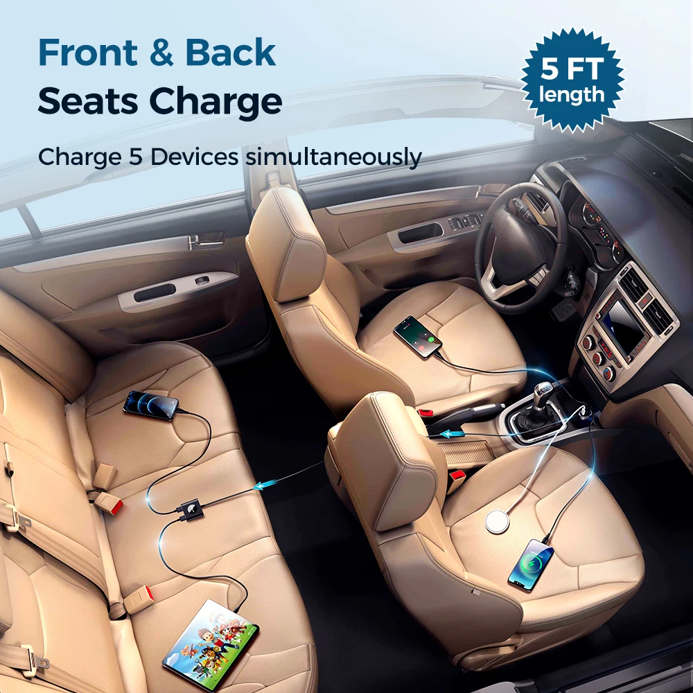 【Diseñado para viajes y familias numerosas】Hay 5 puertos USB, 3 para el asiento delantero y 2 para el asiento trasero. Con el cable de carga de 5 pies, permite a los pasajeros del asiento trasero y del asiento delantero cargar simultáneamente sus dispositivos electrónicos fácilmente. Consigue uno para tu próximo viaje familiar o dale esto como un regalo decente a alguien que te importa.
