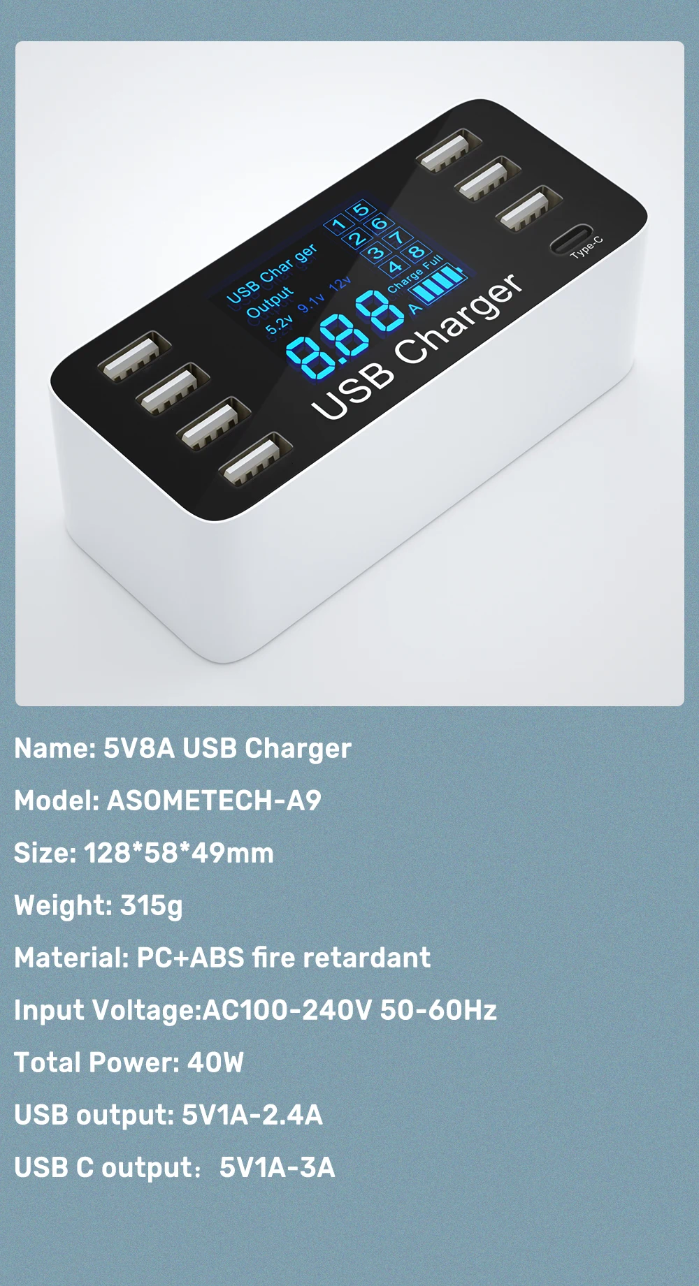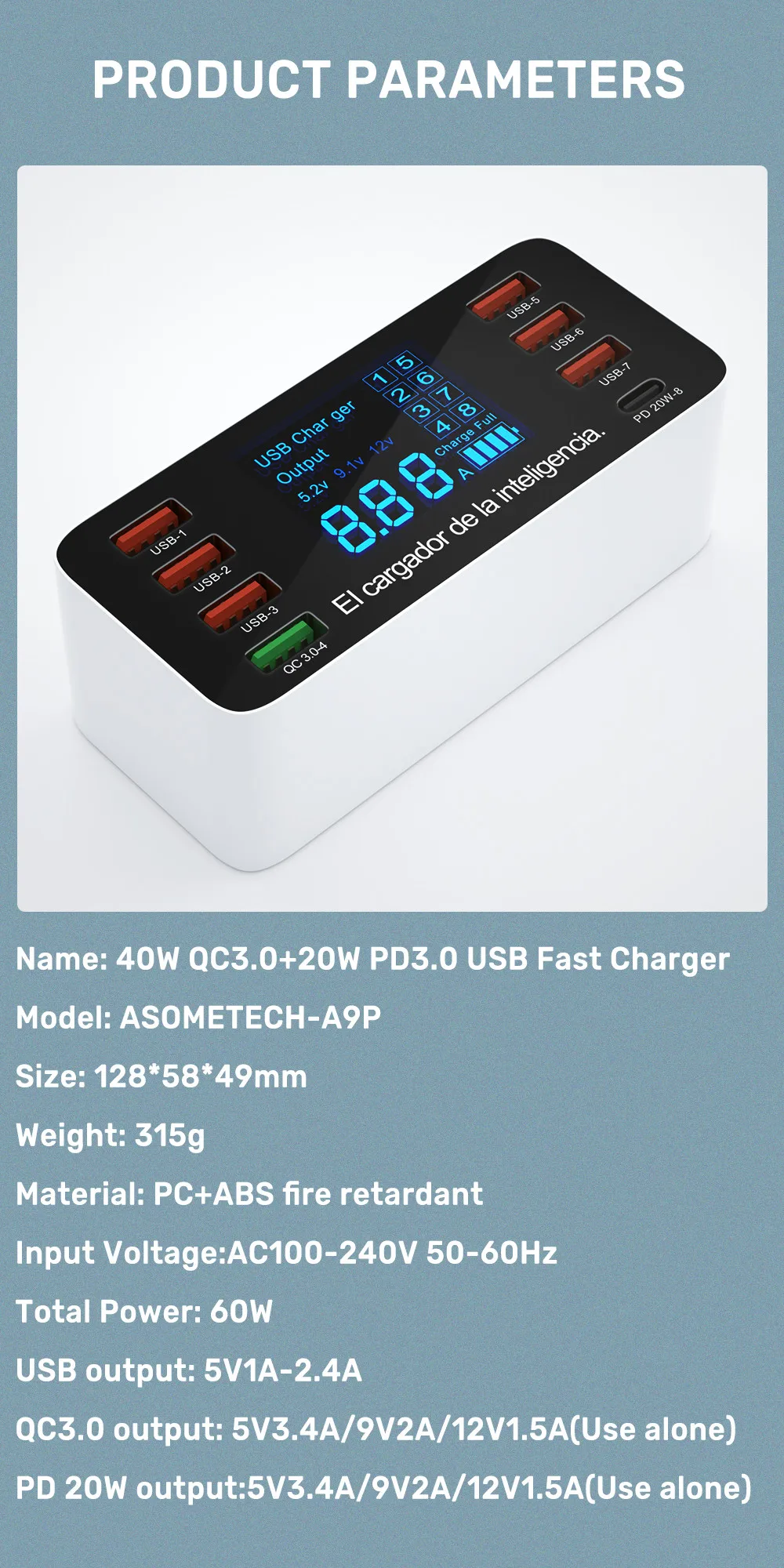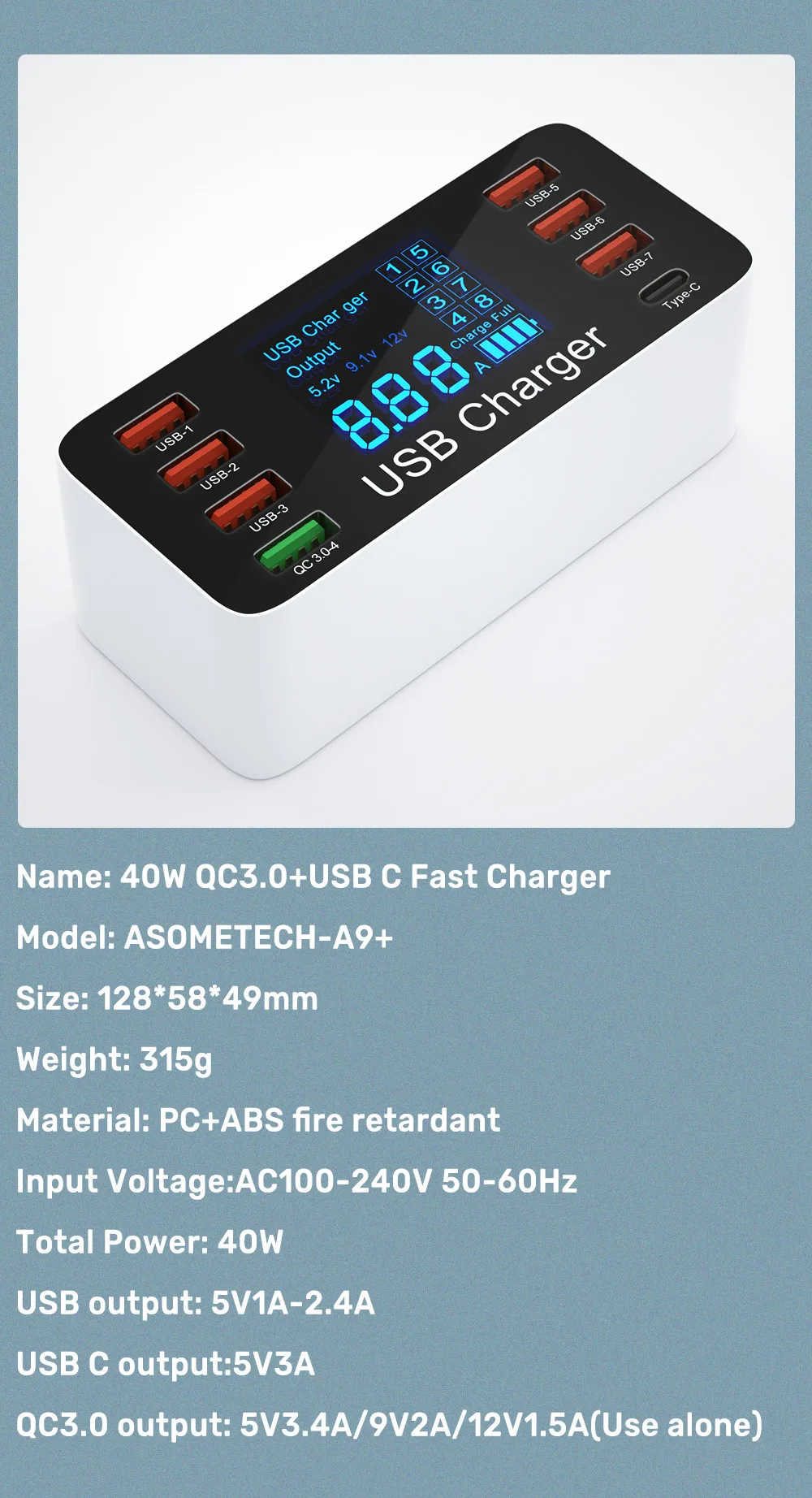 A9P 40W QC3.0 + 20W PD 3.0 USB C + 6 USB A versión