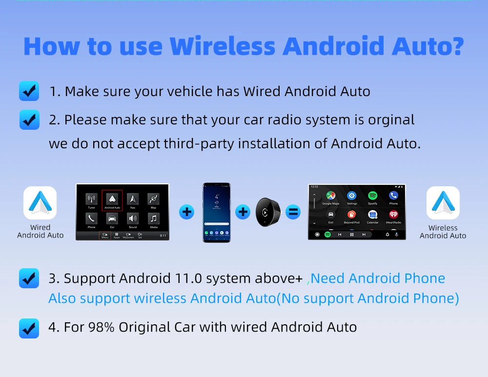 3.Para Android Auto, es compatible con los modelos Android 11 y superiores. Tenga en cuenta que los teléfonos móviles Huawei son especiales. Los dispositivos Huawei tienen su propio sistema operativo móvil: EMUl.Desafortunadamente, Android auto inalámbrico no es compatible con EMUl.