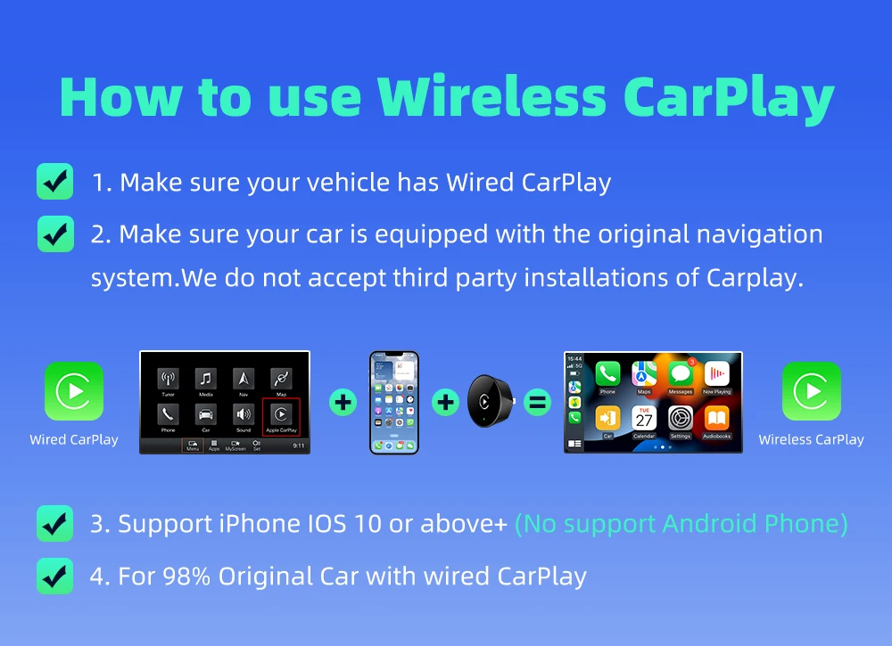 1.Asegúrese de que su automóvil original tenga CarPlay OEM. Este producto es adecuado para el 99% de los automóviles con Carplay con cable original.BMW, Tesla y algunos modelos no son compatibles. Si no estás seguro.Puede ponerse en contacto con el servicio de atención al cliente para realizar una consulta.