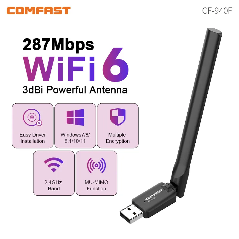 Comprar Adaptador Comfast 287Mbps tarjeta WiFi 2,4G antena 3dBi Wifi6 USB Dongle AX300 802.11ax receptor WiFi inalámbrico PC controlador de ordenador portátil gratis