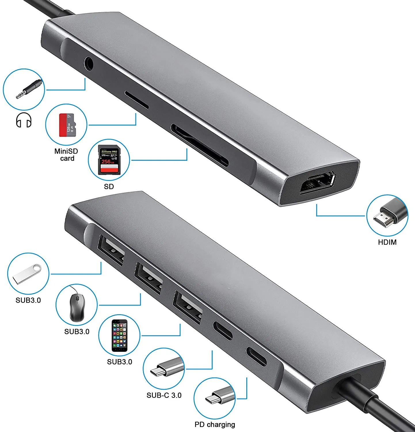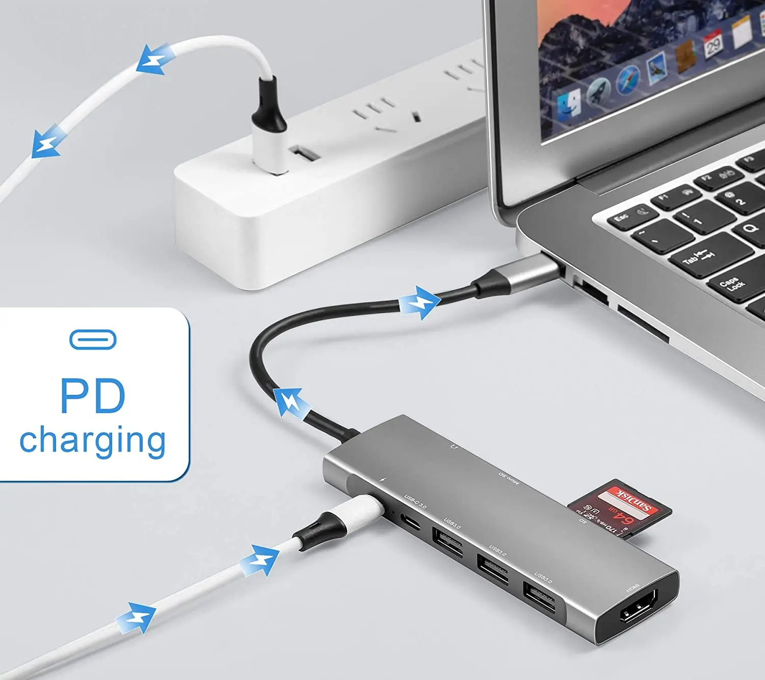 Hub 9 en 1USB C para Macbook/iPad Pro: equipado con un puerto 4K a 30Hz compatible con HDMI, 1 puerto USB 3,0, 2 puertos USB 2,0, un puerto PD, un puerto tipo C y lectores de tarjetas SD TF. Conector de audio de 3,5mm, admite hasta 48 KHz, Salida de audio de 24 bits perfecta para MacBook Pro 2020 2019 2018 2017 2016 de 13 pulgadas y MacBook Air 2020 2019 2018.