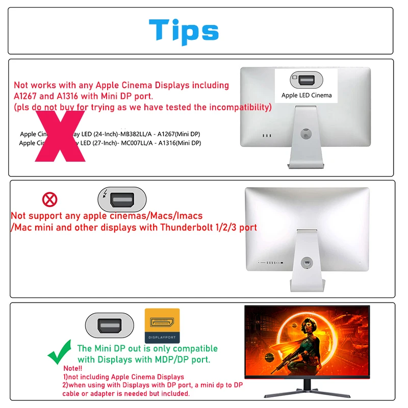 2)El adaptador no funciona con ninguna pantalla de Cine de Apple, incluidos MB382LL/A - A1267 (mini DP) y MC007LL/A - A1316.