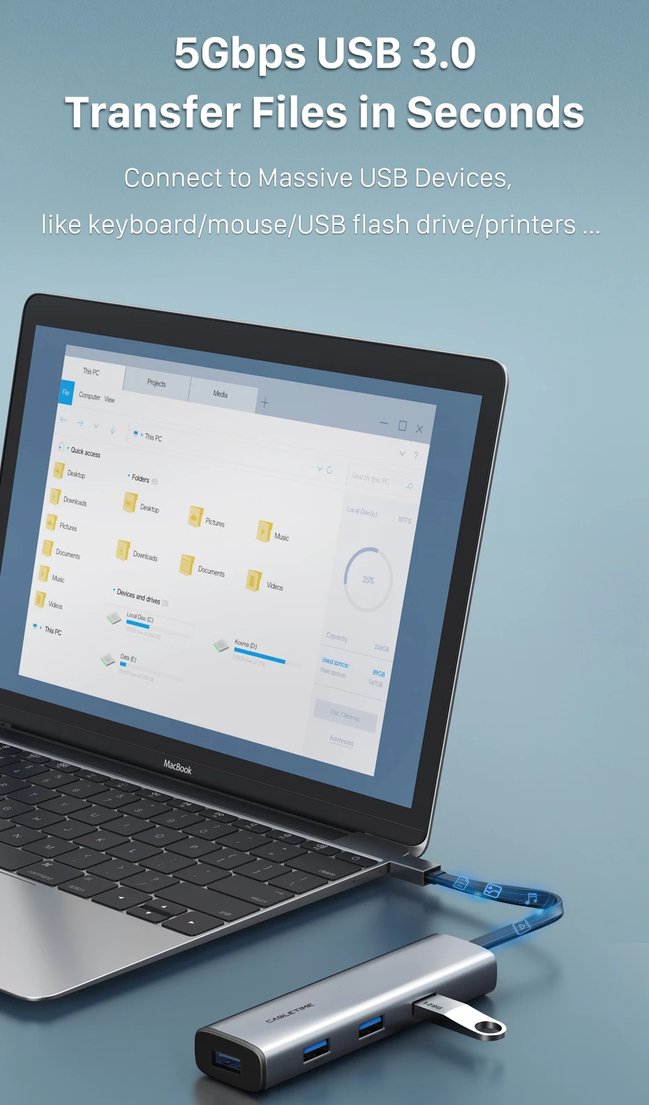 La carcasa del adaptador USB C está hecha de aleación de aluminio, la conductividad térmica rápida y el proceso de oxidación con chorro de arena con buena disipación de calor hacen que el concentrador se sienta delicado y antiarañazos.