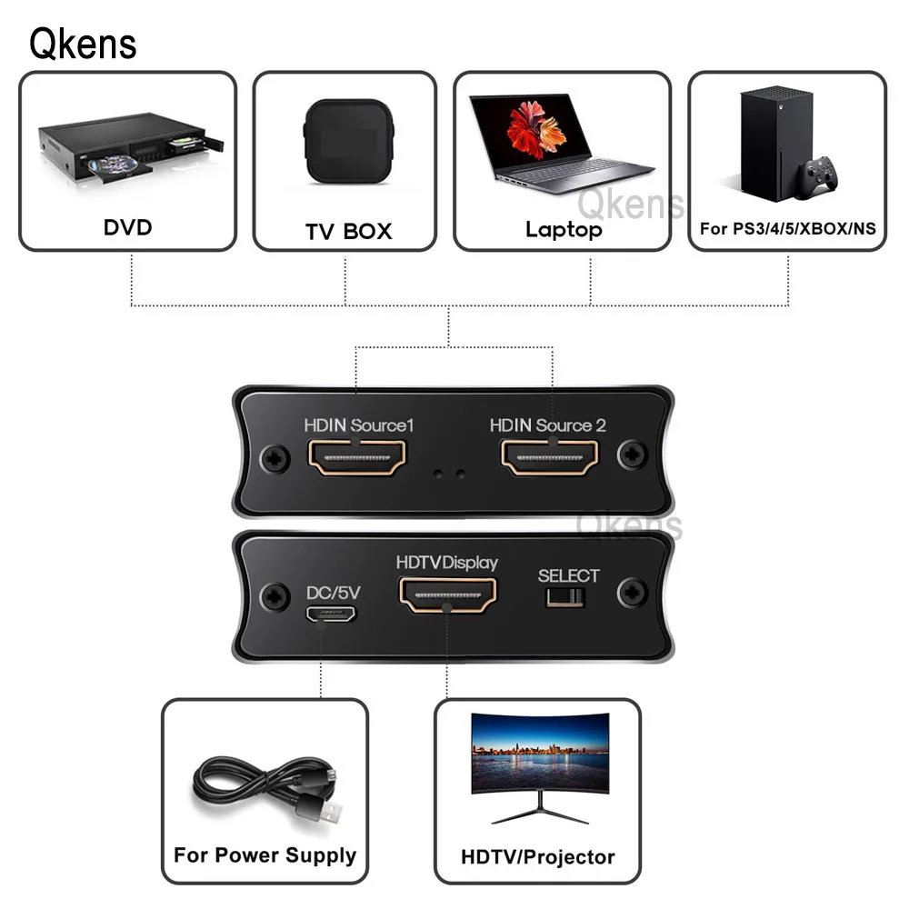 Introducción del producto: Producto original de fábrica nuevo y de alta calidad, ¡compre con confianza! Este conmutador HDMI 8K 2x1 te ofrece una excelente manera de ordenar tu cine en casa. Le permite conectar hasta 2 fuentes HD y puede cambiar las fuentes HD de manera muy conveniente utilizando el botón de interruptor en la unidad. El sistema es compatible con HDMI 2.1, 3D y 8K@60hz Ultra HD. Transmisión unidireccional: este conmutador HD de 8K permite entrada de 2 canales y salida de 1 canal, Puedes conectar dos fuentes de vídeo a una pantalla.