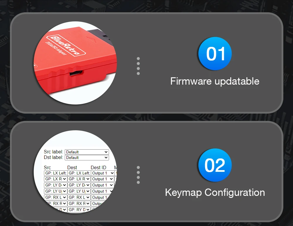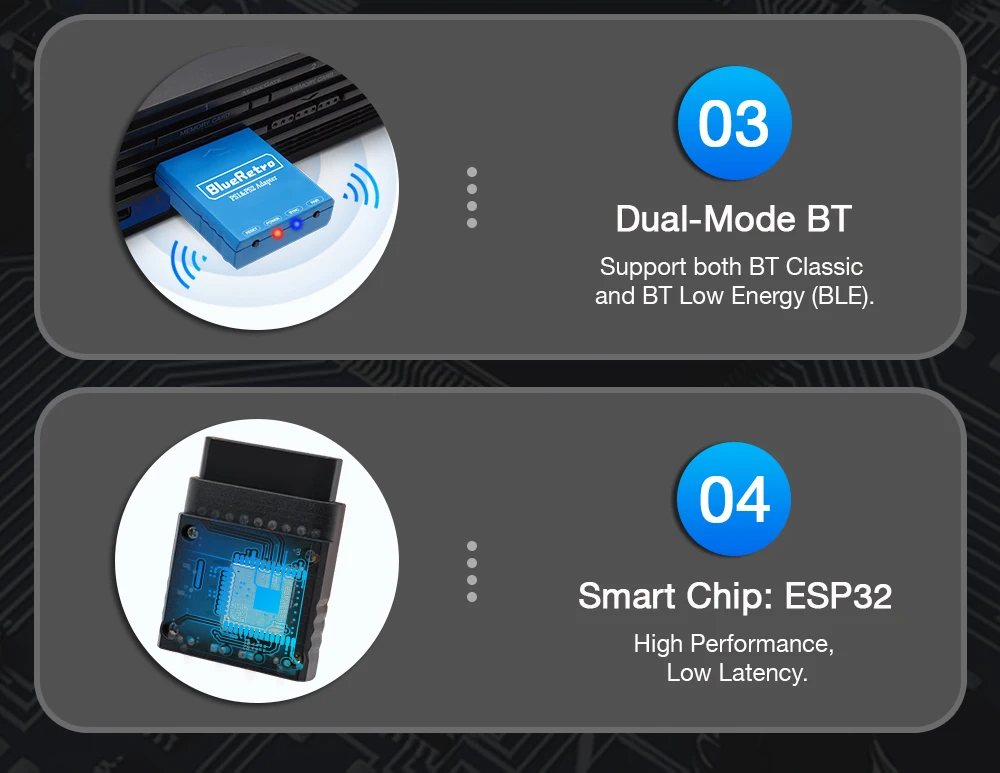 BlueRetro, un adaptador de controladores Bluetooth multijugador para consolas PS1/PS2, es un proyecto de código abierto basado en. Utiliza el popular chip ESP32.Puede admitir el controlador inalámbrico de consola Wii, Switch, PS3, PS4, PS5, Xbox One original.