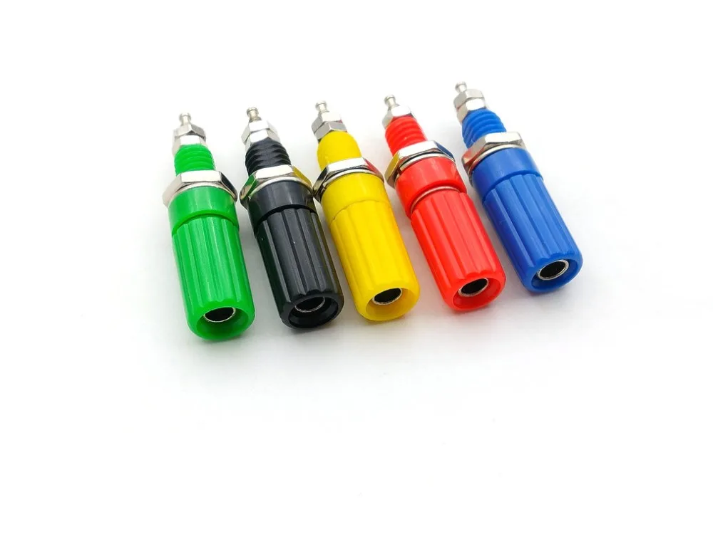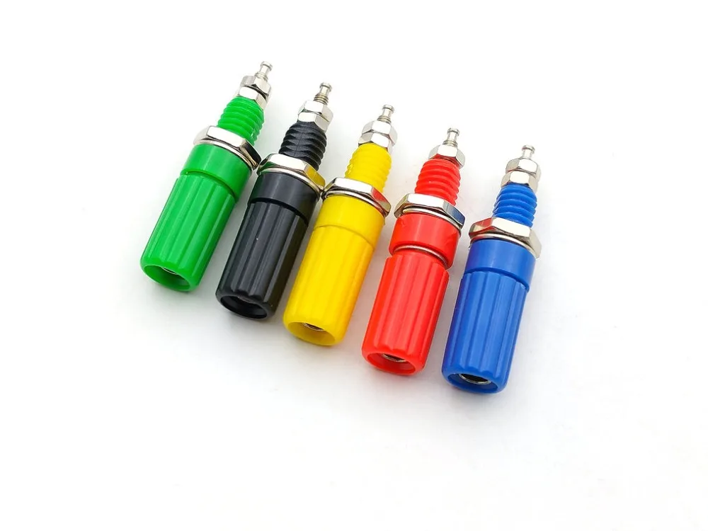 Tapones banana de 4mm de diámetro aplicables. Las conexiones internas son terminales de soldadura.