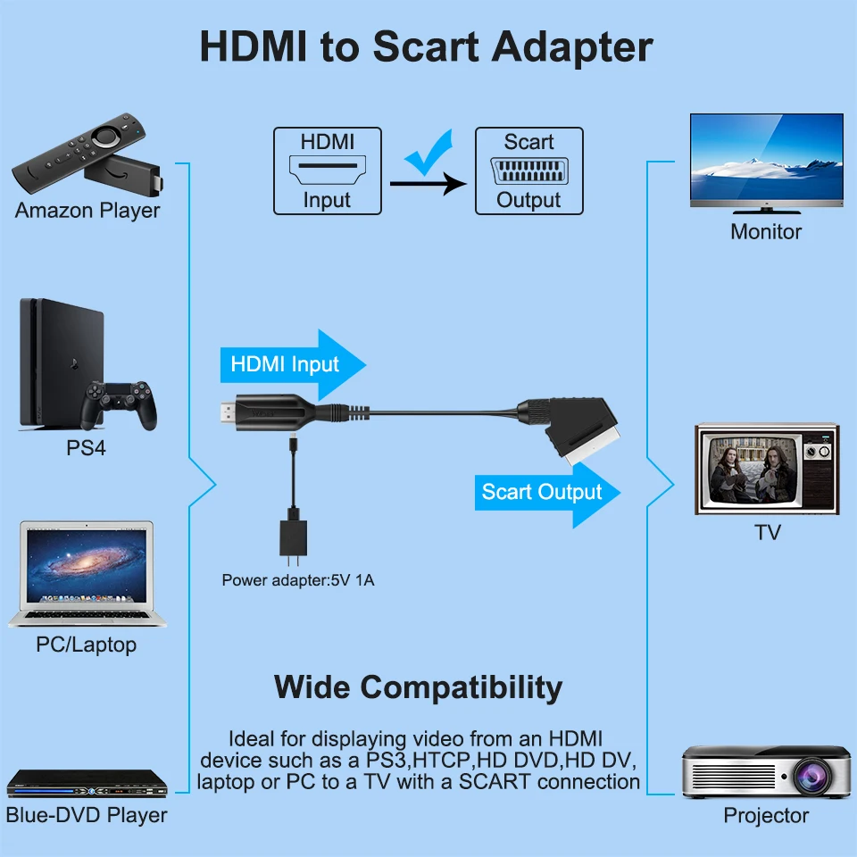 Comprar Adaptador convertidor de Audio y vídeo HDMI a SCART 1080P para HDTV DVD Sky Box STB Plug and Play con Cable de alimentación
