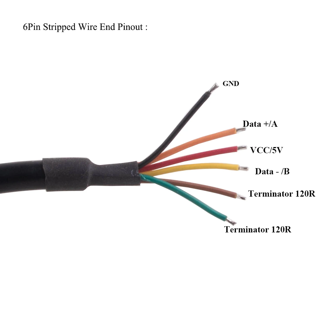 Este cable tiene 6 salidas:GND (Negro), Data-(Amarillo), 5vPower(RED), Terminator1 (Marrón), Data + (Naranja), Terminator 2 (Verde).