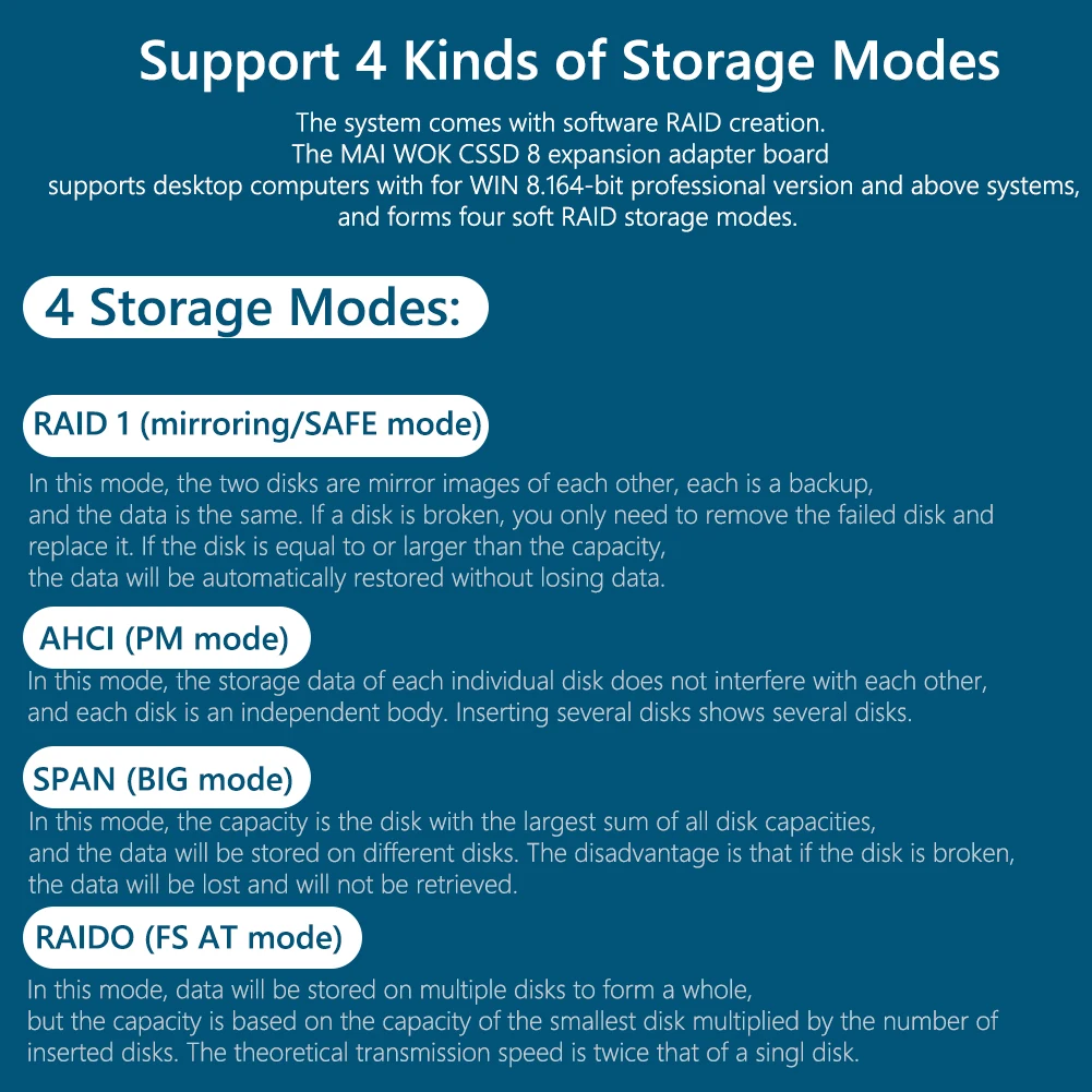 PCI-E a 10 puertos SATA3.0 PCI-E 1X Tarjeta de expansión PCI Express 3,0 GEN3 6Gbps Adaptador Convertidor para PC de escritorio Característica: Chip potente. Adopta el control principal AS Media Xiangshuo, transmisión estable y de alta velocidad, diseño de estructura preciso y firme. Admite 4 tipos de modos de almacenamiento. El sistema viene con software de creación de RAID. La placa adaptadora de expansión MAI WOK CSSD 8 admite ordenadores de escritorio con versión profesional WIN de 8.164 bits y sistemas superiores, y forma cuatro modos de almacenamiento RAID suaves. Admite disco duro de interfaz SATA/Unidad óptica/unidad de estado sólido SSD. Compatible con interfaz PCI-E 4X. Con la arquitectura PCI Express 3,0, la velocidad teórica del ancho de banda unidireccional de un solo canal (1X) es cercana a 1 GB/s; la velocidad teórica del Canal 1 de este producto (1X) el ancho de banda bidireccional puede alcanzar los 8 GB/s. Indicador de monitoreo LED. La luz azul siempre está encendida cuando se inserta el disco duro y la luz azul parpadea al leer datos. Supervise el estado de funcionamiento del disco duro en cualquier momento. Con disipador térmico. El chip duradero y duradero mejora la disipación del calor, la resistencia a altas temperaturas de larga duración y un funcionamiento más estable. No es necesario conducir, enchufar y usar. Compatible con Windows, Linux, MAC.NAS, Synology, etc. Especificación: Nombre del producto: Tarjeta de expansión de 10 puertos PCI-E a SATA3.0 Opciones del producto: Interfaz 10-port-1X Color del producto: PCB negro Material del producto: Metal Producto Maestro: AS Media ASM 1166 maestro Velocidad de transmisión de datos: 6000 (MB/s) Peso del producto: 90g Tamaño del producto: 120x85x68mm/4,72x3,35x2.68in Interfaz del producto: PCI-E 1X (recomendado para usar en menos de 30 minutos, más rápido). Sistema de soporte: Para WIN8/WIN10/Synology / Ubuntu 4 modos de almacenamiento: RAID 1 (modo espejo/seguro) En este modo, los dos discos son imágenes especulares entre sí, cada uno es una copia de seguridad y los datos son los mismos. Si un disco está roto, solo necesita quitar el disco defectuoso y reemplazarlo. Si el disco es igual o mayor que la capacidad, los datos se restaurarán automáticamente sin perder datos. AHCI (modo PM) En este modo, los datos de almacenamiento de cada disco individual no interfieren entre sí, y cada disco es un cuerpo independiente. Insertar varios discos muestra varios discos. SPAN (modo GRANDE) En este modo, la capacidad es el disco con la mayor suma de todas las capacidades de disco, y los datos se almacenarán en discos diferentes. La desventaja es que si el disco está roto, los datos se perderán y no se recuperarán. RAIDO (modo FS AT) En este modo, los datos se almacenarán en varios discos para formar un todo, pero la capacidad se basa en la capacidad del disco más pequeño multiplicado por el número de discos insertados. La velocidad de transmisión teórica es el doble que la de un solo disco. Nota: Debido a los diferentes monitores y efectos de luz, el color real del artículo puede ser ligeramente diferente del color que se muestra en las imágenes. ¡Gracias! Permita una desviación de medición de 1-2cm debido a la medición manual. 1 X CD 1 X deflector de media altura ![]() ![]() ![]() ![]() ![]() ![]() ![]() ![]() ![]() ![]() ![]() ![]() ![]() ![]()