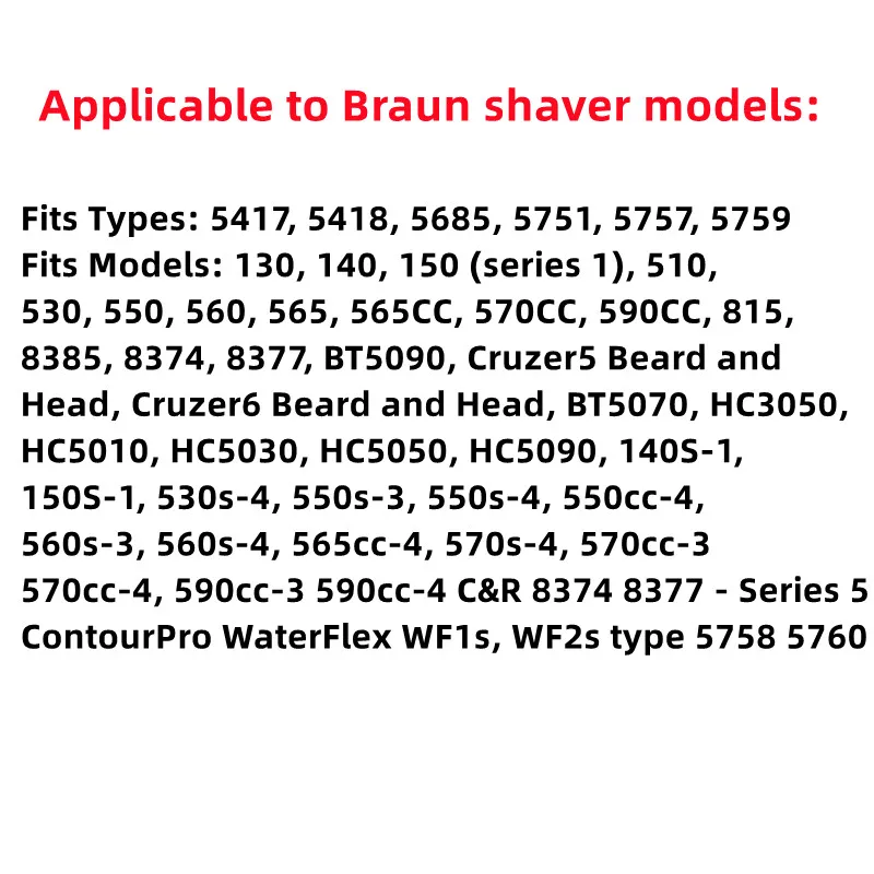 Se adapta a los modelos: 130, 140, 150 (serie 1), 510, 530, 550, 560, 565, 565CC, 570CC, 590CC, 815, 8385, 8374, 8377, BT5090, cruzer5 Barba y Cabeza, Cruzer6 Barba y Cabeza, BT5070, HC3050, HC5010, HC5030, HC5050, HC5090, 140S-1, 150S-1, 530s-4, 550s-3, 550s-4, 550cc-4, 560s-3, 560s-4, 565cc-4, 570s-4, 570cc-3 570cc-4, 590cc-4 C & R 8374 8377 - Serie 5 ContourPro WaterFlex WF1s, WF2s tipo 5758 5760
