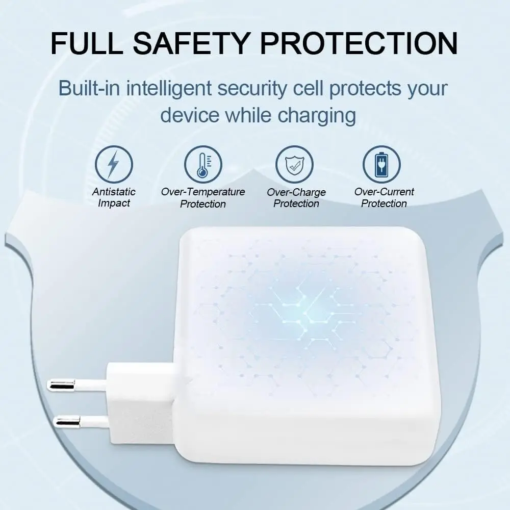 Pasó las pruebas UL / CE / FCC / RoHS y fue fabricado con materiales de la más alta calidad. Nuestro adaptador de carga tipo C tiene tecnología exclusiva para resistir el cargador de cortocircuito, sobrecorriente, sobretensión, sobrecalentamiento y sobrepotencia.