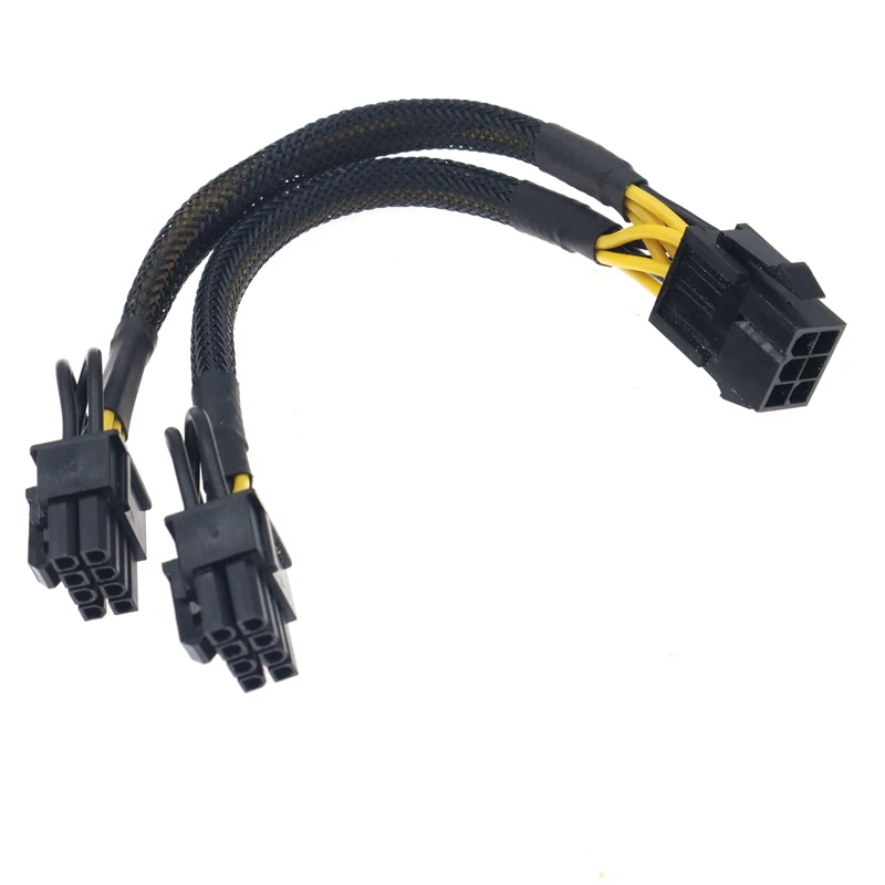 Un extremo hembra para conectar al conector de alimentación de la fuente de alimentación y dos extremos macho para conectar a la tarjeta gráfica de vídeo.