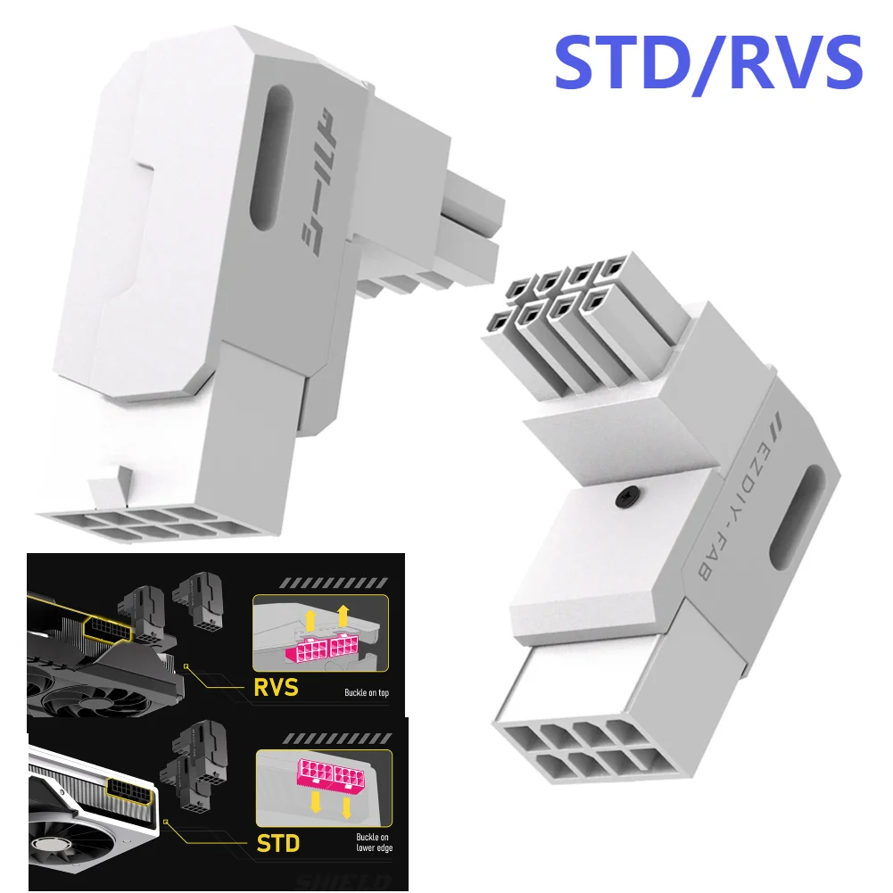 2.Amplia compatibilidad:El cabezal del adaptador de corriente ofrece un 90° ángulo con orientaciones STD y RVS, compatible con todas las tarjetas gráficas NVIDIA y AMD equipadas con un conector de alimentación de 8 pines, así como cualquier dispositivo con un conector de alimentación PCIe de 8 pines, que satisface diversas necesidades.