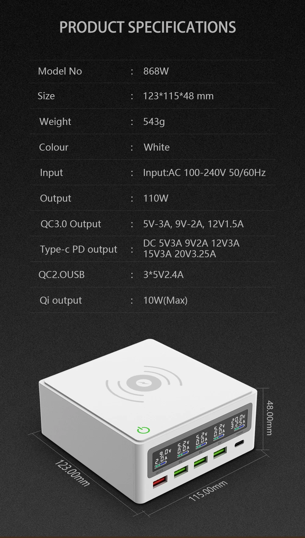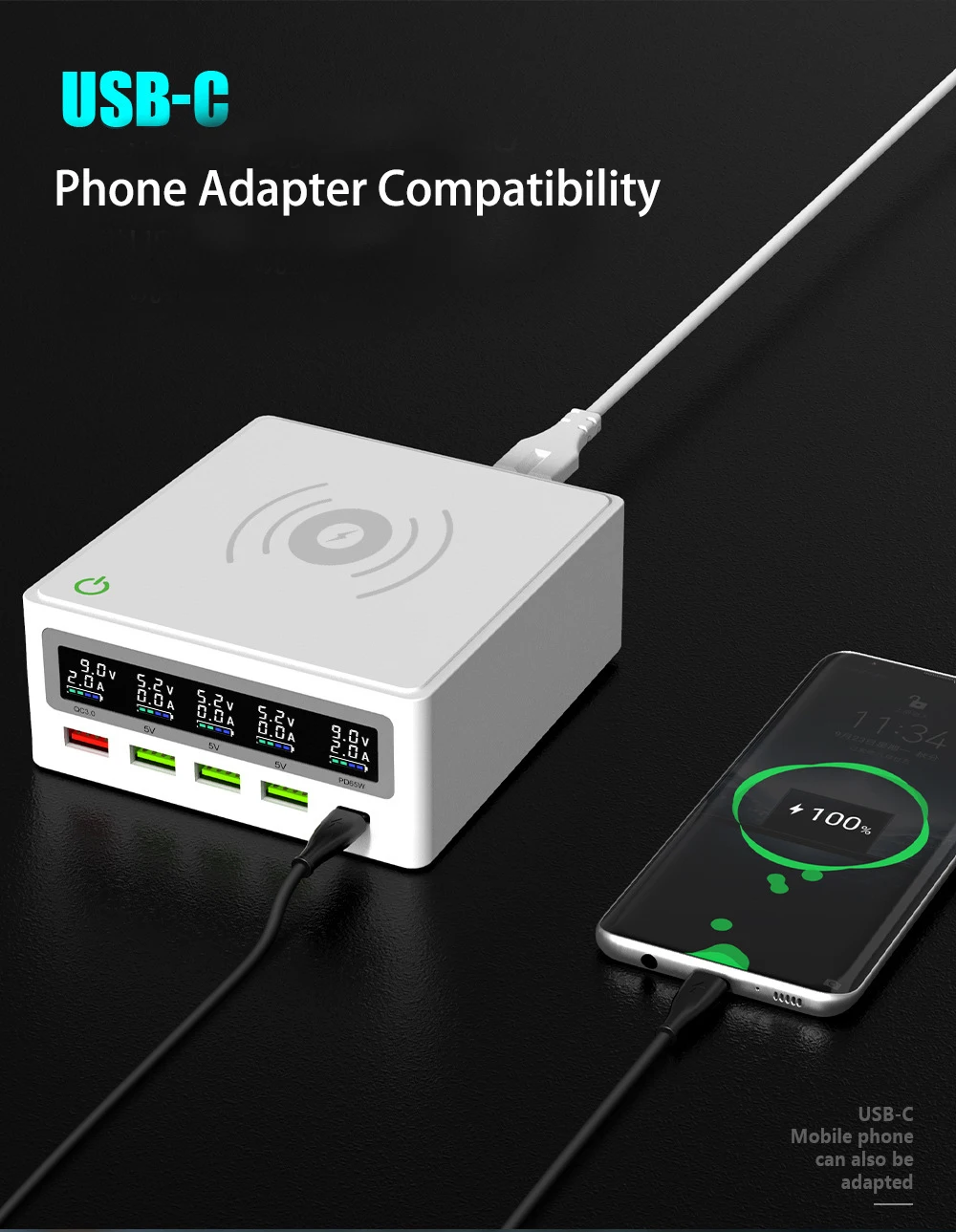 Carga rápida y simultánea para 7 dispositivos: 1 puerto de carga rápida USB QC 3,0. 3 puertos USB estándar con tecnología de Chip inteligente IC para todos sus teléfonos y tabletas y otros dispositivos alimentados por USB; 1 puerto USB tipo C para dispositivos cargados USB tipo C de 5V, 1 almohadilla de carga inalámbrica Qi, lo que permite una rápida, Carga inalámbrica de cualquier teléfono habilitado para Qi; Deshazte del desorden del cable y deja de usar todos tus enchufes de pared cuando puedas cargar todos tus dispositivos a la vez.