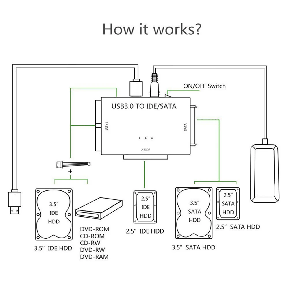 Adaptador de disco duro SATA a USB 3.0, combo USB IDE SATA, convertidor de transferencia de datos para unidad óptica 2.5/3.5/5.25 de HDD, SSD