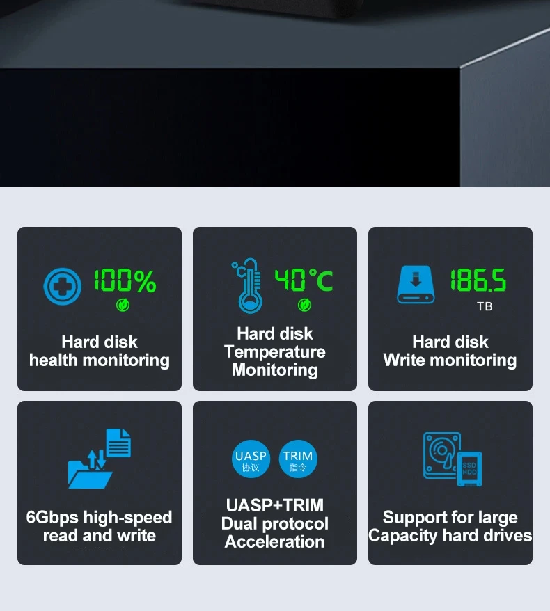 Material principal: estructura principal de aleación de aluminio, mayor disipación del calor, mayor protección de los datos del disco duro.