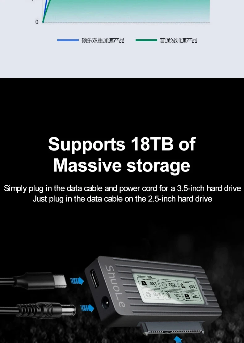 Fuente de alimentación: el cable USB de disco duro de 2,5 pulgadas puede obtener energía directamente sin fuente de alimentación externa, y el disco duro de 3,5 pulgadas debe conectarse con la fuente de alimentación.