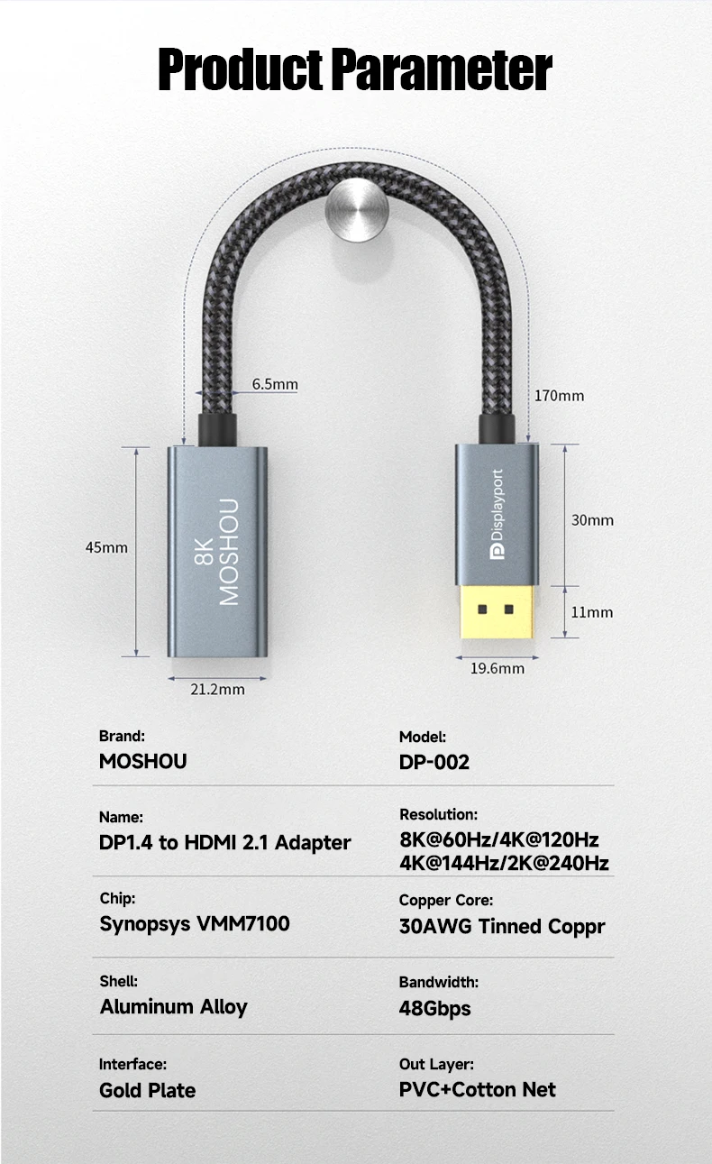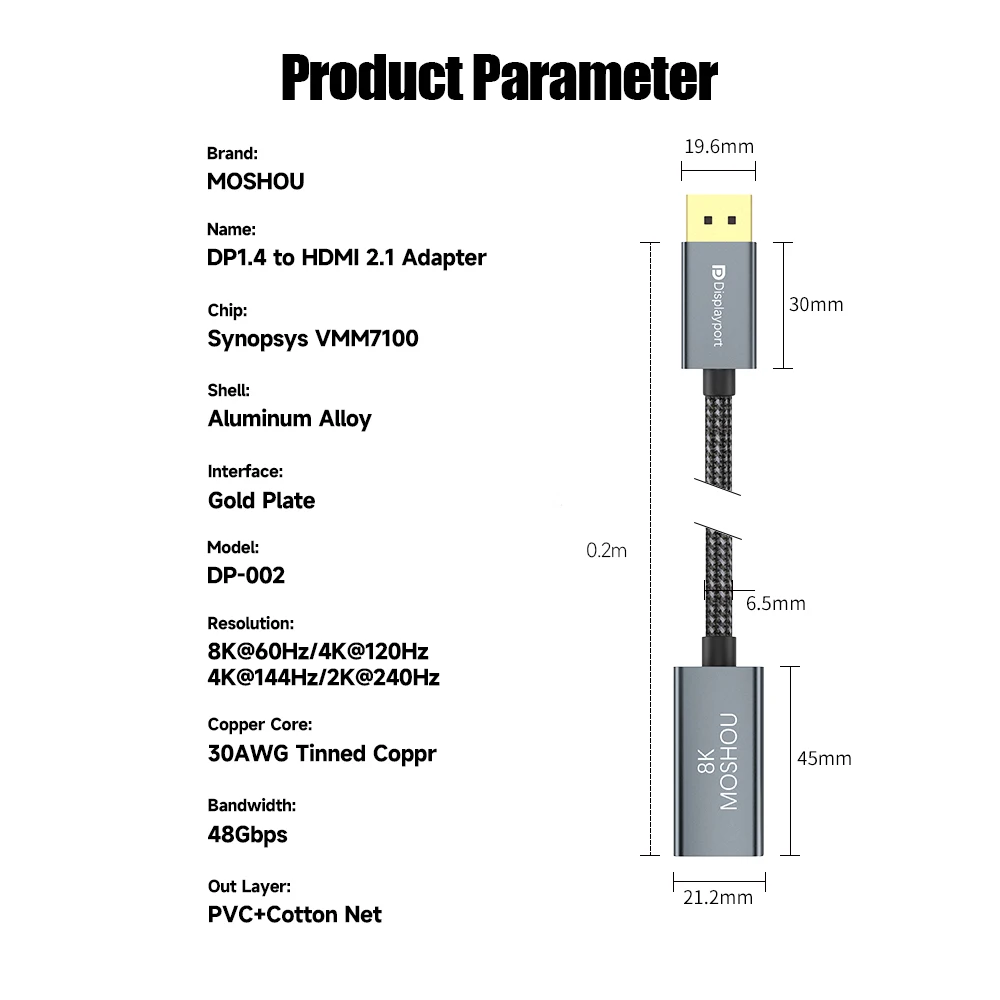 Copiar código y usar100-12:ESFUN12200-24:ESFUN24300-45:ESFUN45Adaptador DP 1,4 a HDMI 2,1