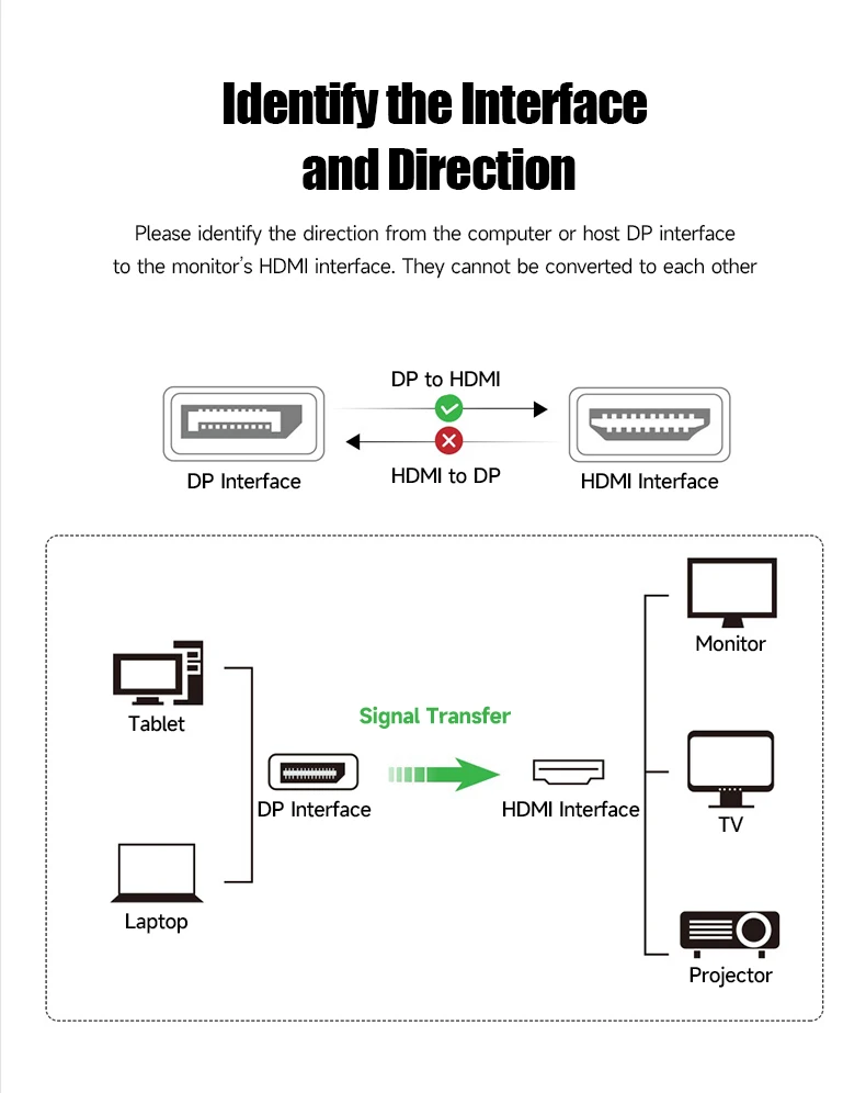 Identifica la dirección desde la interfaz DP del ordenador o host a la interfaz HDMI del monitor. No se pueden convertir entre sí
