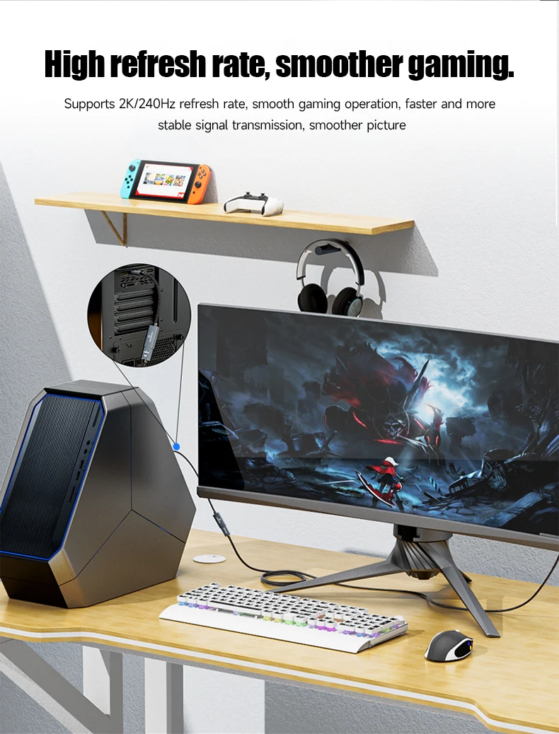 Admite frecuencia de actualización de 2K/240Hz, funcionamiento de juego suave, transmisión de señal más rápida y estable, imagen más suave