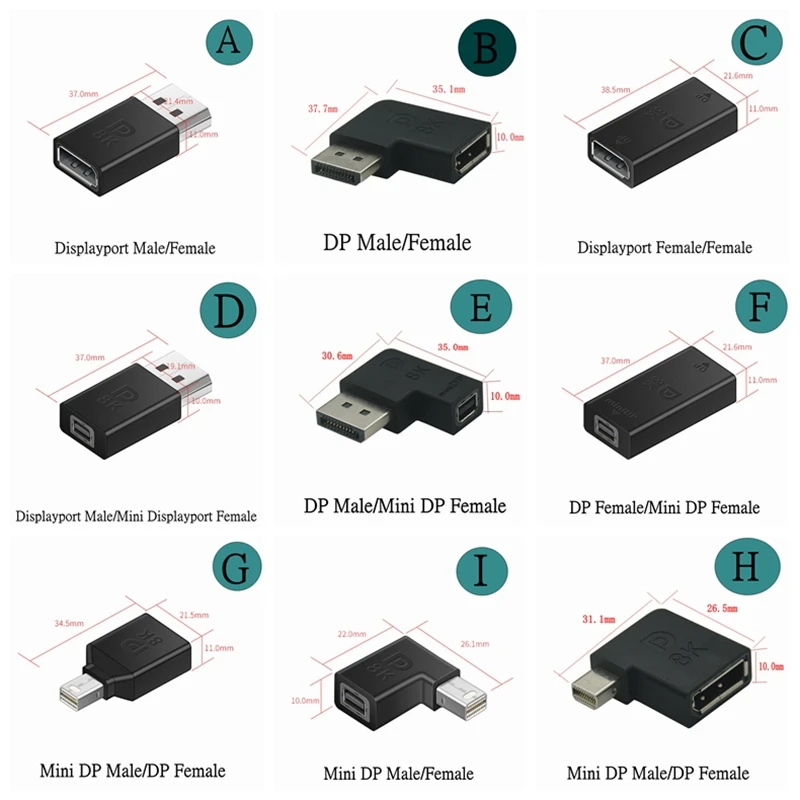 Opciones de interfaz: DP hembra a hembra, DP macho a hembra, MiniDP macho a DP hembra.