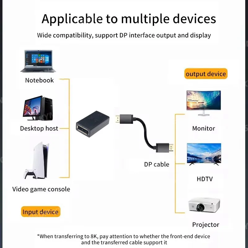Extensor DisplayPort 1,4, el acoplador de cable DisplayPort extiende la longitud del cable a su computadora con un puerto de salida DP, DP ++ o DisplayPort ++; conecte dos cables cortos en un cable largo para realizar la transmisión a larga distancia y resolver fácilmente el problema de la decoración insuficiente/líneas preincrustadas.