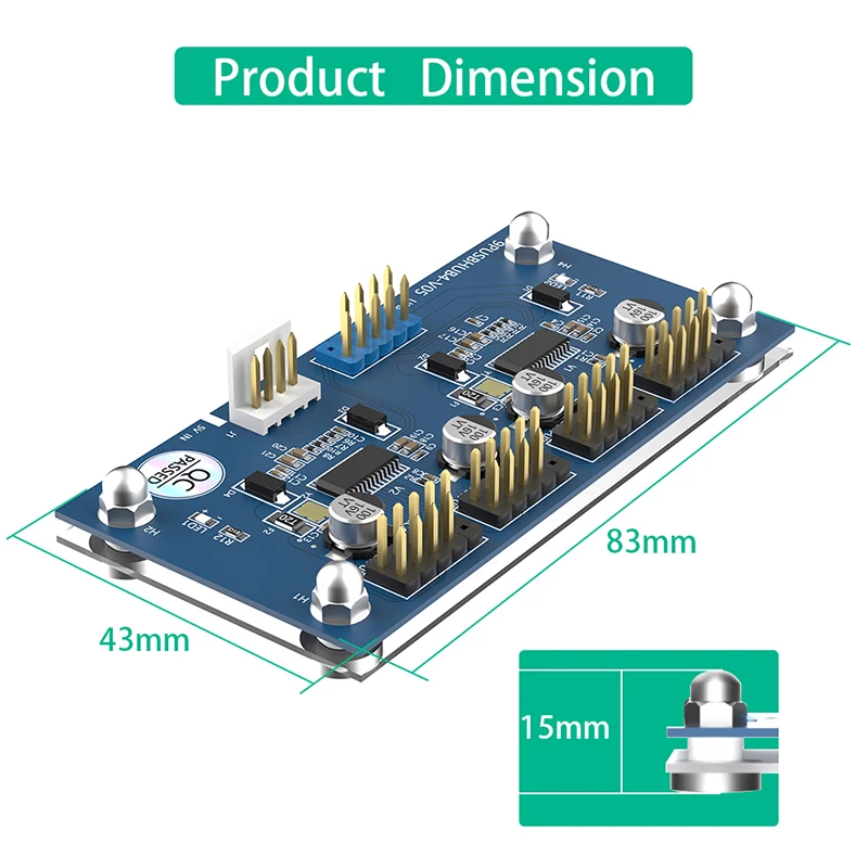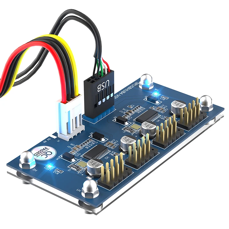 Un lado se conecta al puerto de 9 pines de la placa base, el otro lado se divide a 4x9 pines.