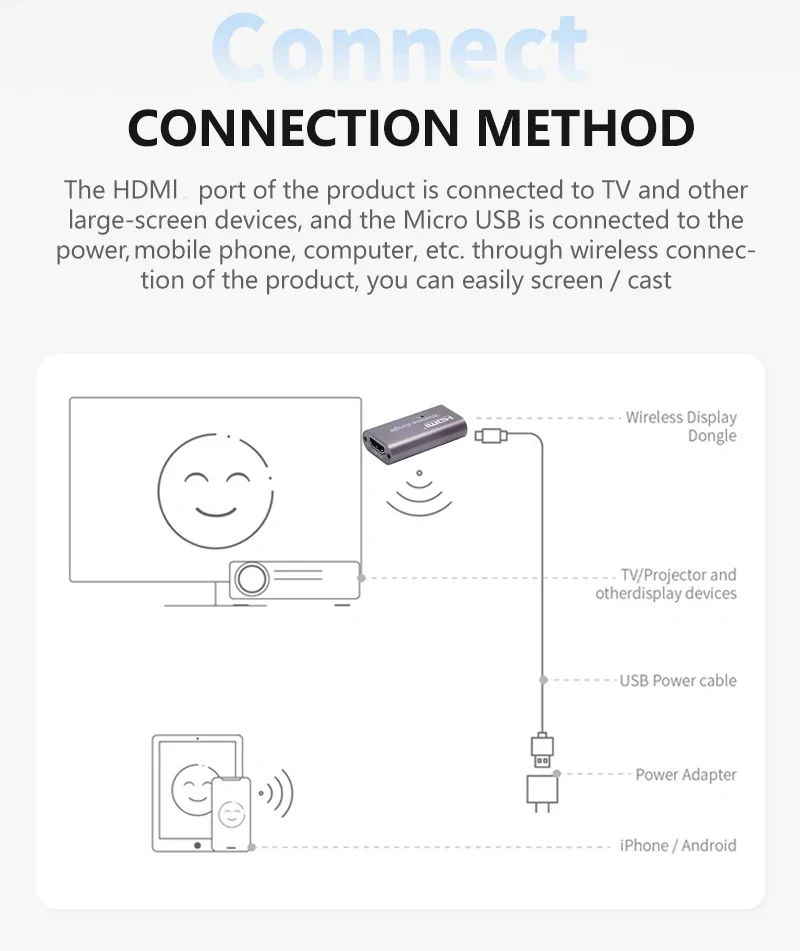 - Transmita contenido de forma inalámbrica desde un teléfono inteligente/tableta/portátil a un televisor/proyector o monitor de pantalla HDMI.