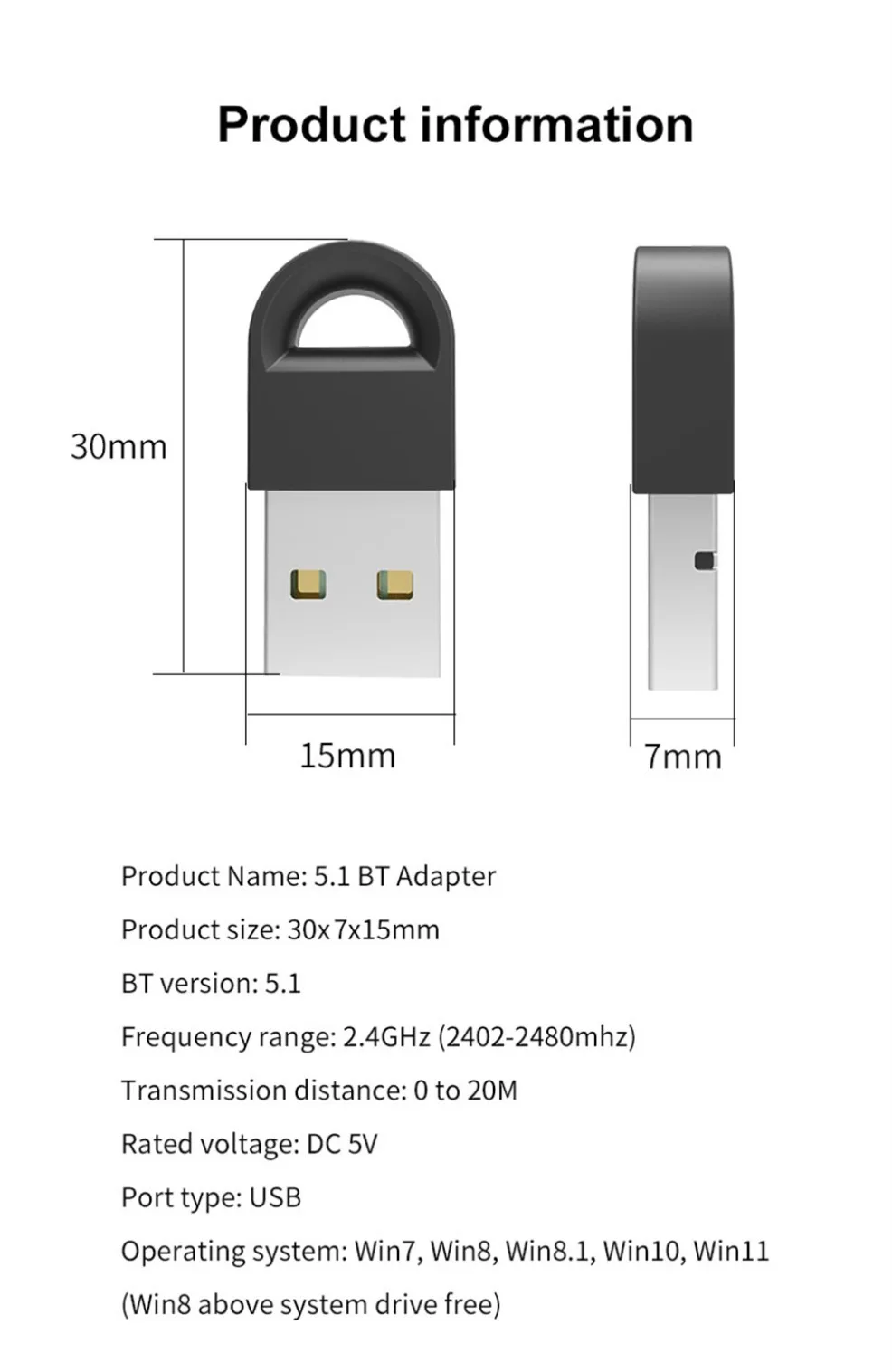 Notes: Only works with PC and laptop, not for all IOS devices, including Mac, iPad and iPhone, it will not work in car stereo or TV Specifications: Fully compatible with Bluetooth 2.0, Bluetooth 2.1, Bluetooth 3.0, Bluetooth 4.0 and Bluetooth 4.2 specifications. Comply with Bluetooth 5.0 technical specifications, dual mode transmission. Farther transmission distance: no blocking, strong signal. 24Mbps transmission rate, providing stable and high-speed transmission of file and audio data. Intelligent sleep wake-up energy-saving, 24-bit CRC check to resist interference, adaptive frequency hopping to reduce crosstalk. Item Name: USB Bluetooth 5.0 Adapter Material: Plastic + Metal Bluetooth-compatible Version: 5.1/5.0 Interface: USB 2.0 Compatible System: for Windows XP/Win7/Win8/Win8.1/Win10/11 Features: Mini, Plug and Play, High Speed, Easy to Carry Package Includes: 1 x USB Bluetooth 5.1 Adapter
